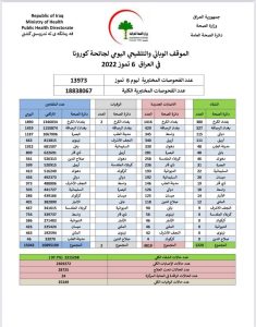 أعلنت وزارة الصحة، اليوم الاربعاء، الموقف الوبائي اليومي لجائحة كورونا في عموم العراق.