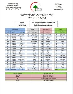 أعلنت وزارة الصحة، اليوم الجمعة، الموقف الوبائي اليومي لجائحة كورونا في عموم العراق.