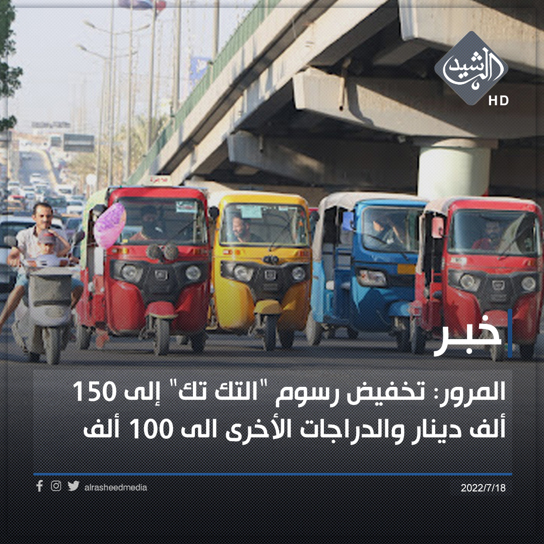 وذكرت المديرية، في بيان تلقته “الرشيد”، انه “بعد حصول مديرية المرور العامة، وبتدخل مباشر من مديرها العام اللواء الحقوقي ( طارق الربيعي)، على الموافقات الرسمية بما يخص تخفيض رسوم تسجيل الدراجات من مجلس الوزراء، اصبح تسجيل دراجة التكتك 150 الف دينار والدراجات الاخرى الى 100 الف دينار”.