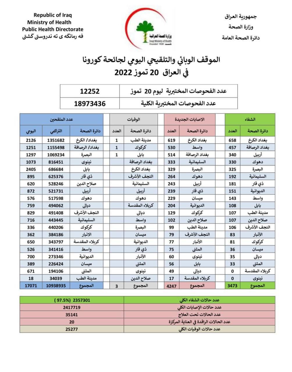 أعلنت وزارة الصحة، اليوم الاربعاء، الموقف الوبائي اليومي لجائحة كورونا في عموم العراق.