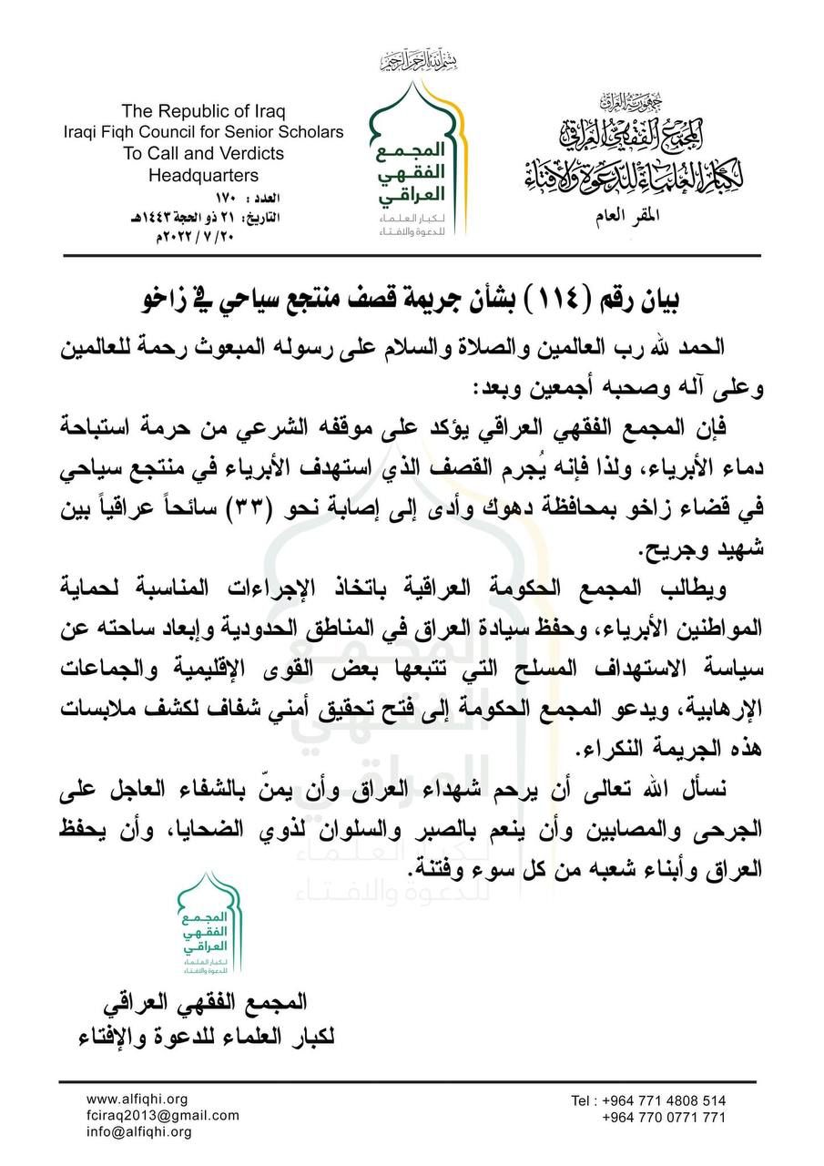 محلياتالمجمع الفقهي العراقي يُجرم القصف التركي ويطالب بحماية المواطنين قبل 3 سنوات 4 مشاهدات شارك الوسومالقصف التركيقد يهمك أيضا أمن احباط محاولة هروب سجين وسط العاصمة بغداد قبل 27 دقيقة 3 مشاهدات أمن الاستخبارات العسكرية تطيح بـ18 متهماً بقضايا قانونية مختلفة في أربع محافظات قبل 49 دقيقة 7 مشاهدات محليات القضاء يصدر إحصائية بحالات الزواج والطلاق خلال شهر تشرين الثاني الماضي قبل 58 دقيقة 7 مشاهدات ثقافة وفن بطلة فيلم "اللي بالي بالك".. وفاة الفنانة المصرية نيفين مندور إثر حريق بمنزلها قبل ساعة واحدة 9 مشاهدات أمن الداخلية: انخفاض الجرائم الإرهابية بنسبة 88% والدكات العشائرية بنسبة 92 في المئة قبل ساعة واحدة 7 مشاهدات