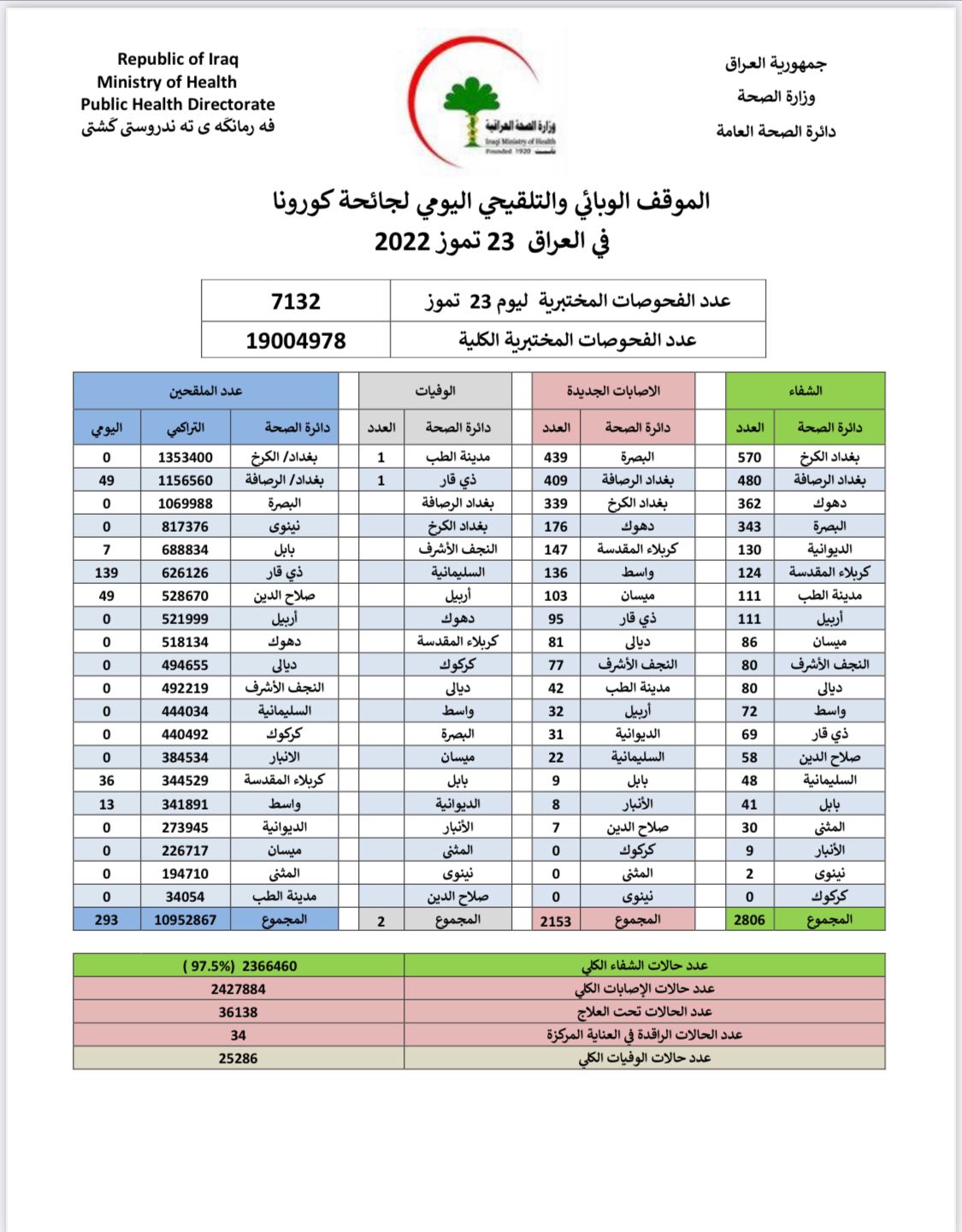 أعلنت وزارة الصحة، الموقف الوبائي لفيروس كورونا في عموم العراق.