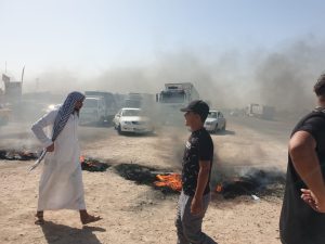أقدم محتجون، اليوم الأحد، على قطع الطريق الرئيسي الرابط بين الناصرية والشطرة بالإطارات المحترقة احتجاجا على شح المياه وتردي الكهرباء.