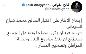 وقال الفياض، في تغريدة على تويتر تابعتها “الرشيد”، “اجماع الاطار التنسيقي على اختيار الصالح محمد شياع السوداني نتوسم فيه ان يكون مصلحاً”.