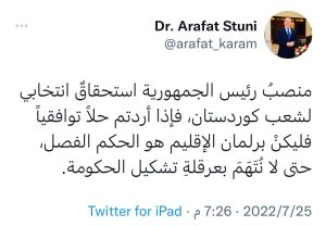 وقال مسؤول ملف العراق في مقر زعيم الحزب الديمقراطي عرفات كرم، عبر تغريدة على تويتر تابعتها “الرشيد”، ان “منصبُ رئيس الجمهورية استحقاقٌ انتخابي لشعب كردستان”.