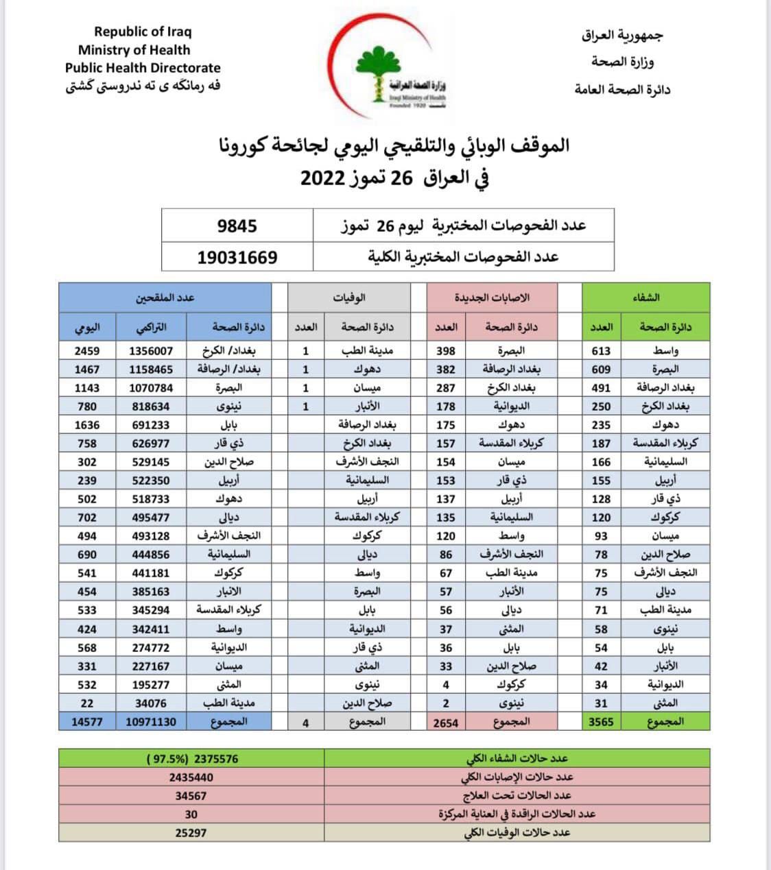 أعلنت وزارة الصحة، اليوم الثلاثاء، الموقف الوبائي اليومي لجائحة كورونا في عموم العراق.