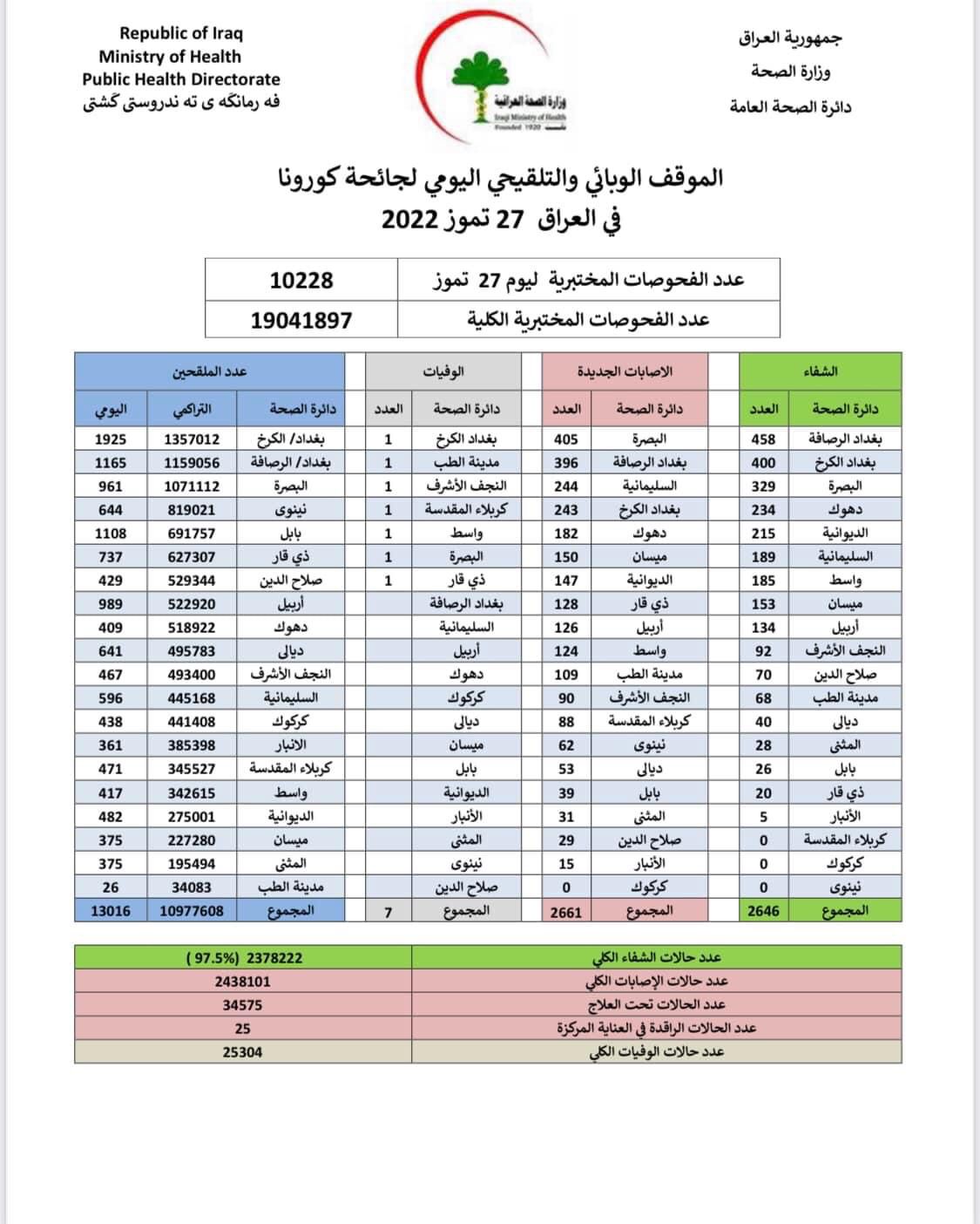 أعلنت وزارة الصحة، اليوم الاربعاء، الموقف الوبائي اليومي لجائحة كورونا في عموم العراق.