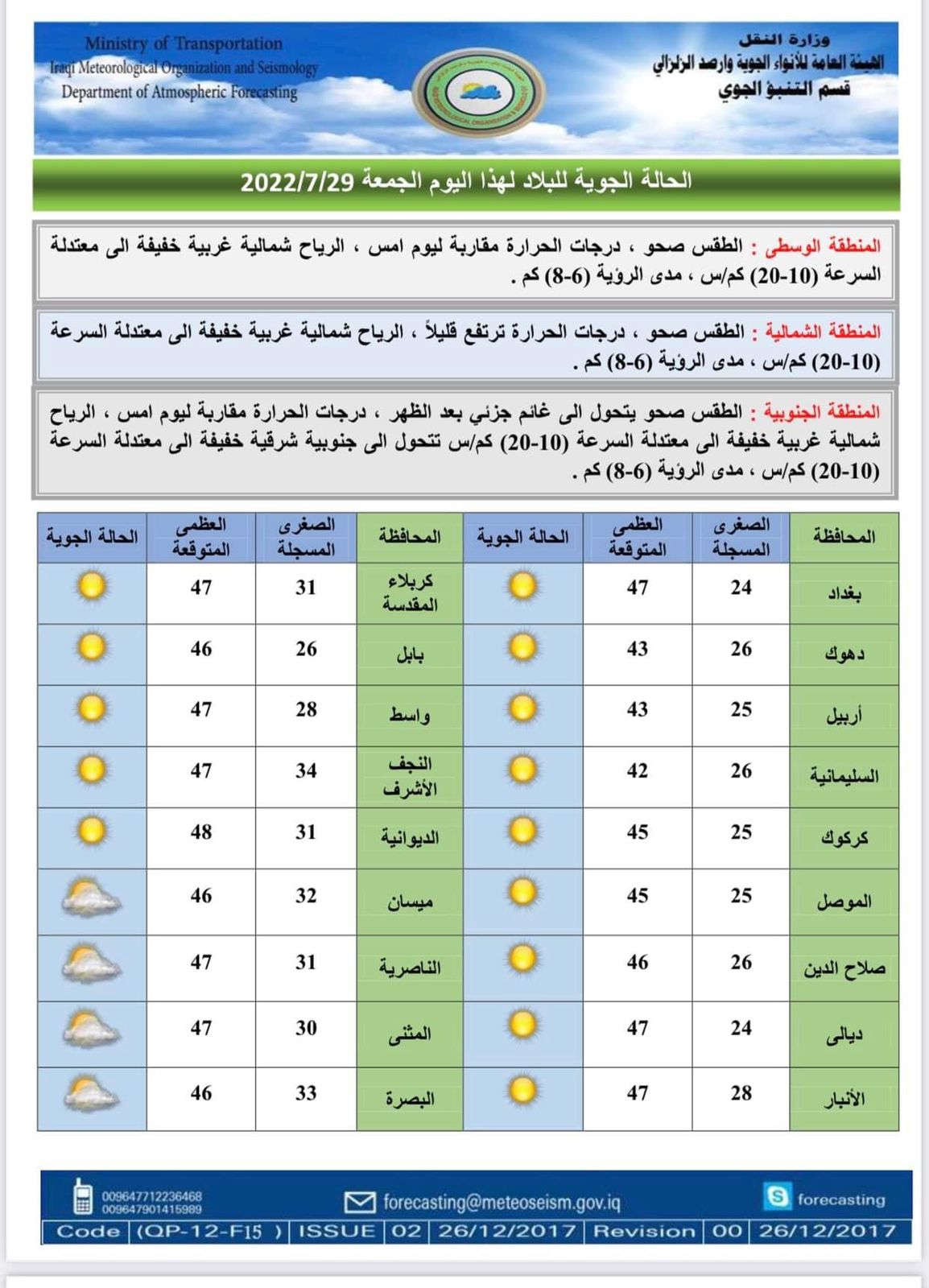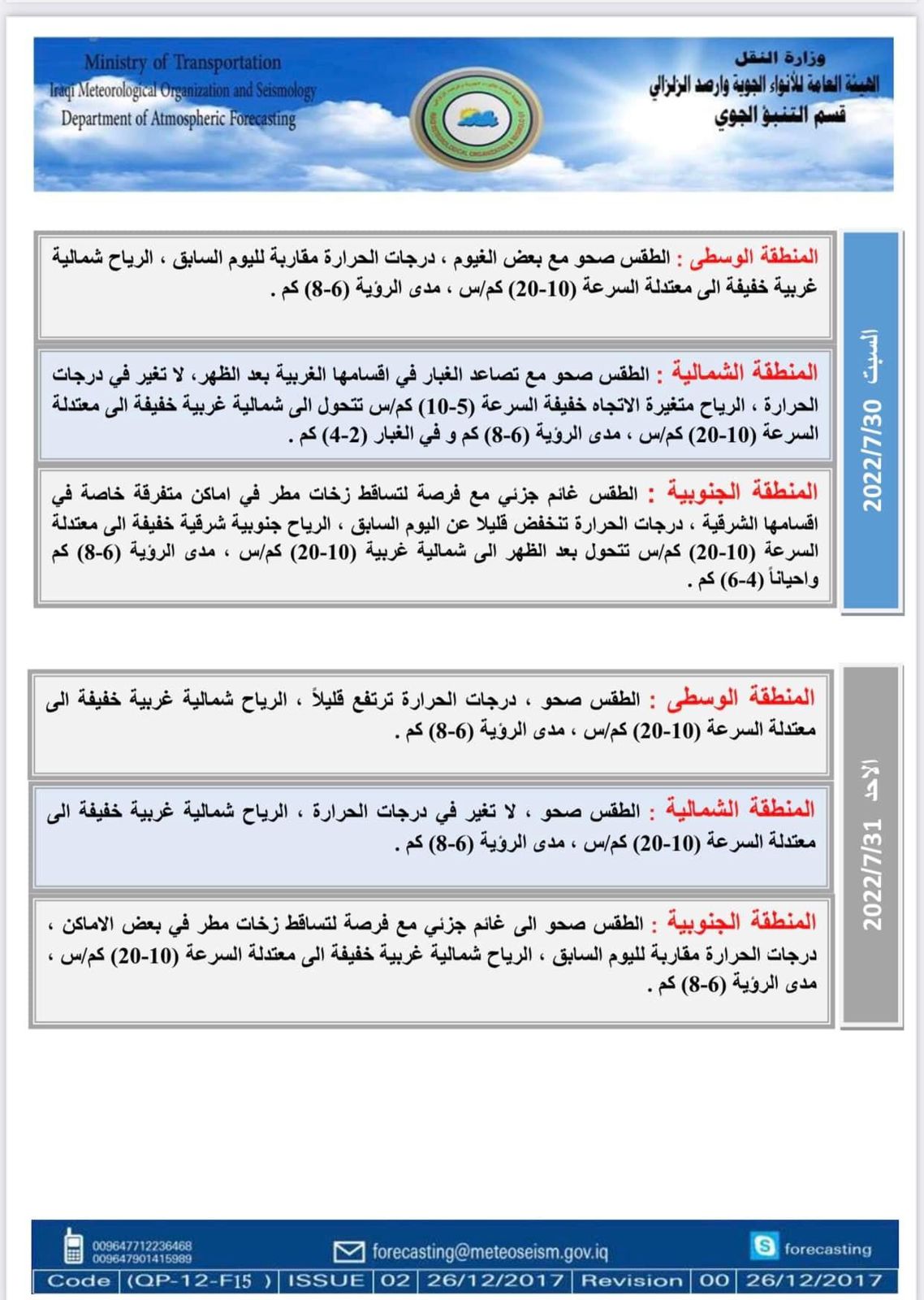 محلياتالانواء الجوية: تساقط للامطار وانخفاض بدرجات الحرارة في المناطق الجنوبية للبلاد قبل 3 سنوات 1 مشاهدة شارك الطقس الوسومالطقسقد يهمك أيضا عربي ودولي غروسي: إيران لم تقدم بيانات عن مخزون اليورانيوم والأضرار بعد الضربات الأمريكية قبل 10 دقائق 3 مشاهدات محليات طقس العراق.. ضباب وارتفاع بدرجات الحرارة خلال الأيام المقبلة قبل 48 دقيقة 7 مشاهدات عربي ودولي ترامب: الضربة المكثفة ضد "داعش" في سوريا كانت ناجحة ودقيقة قبل 58 دقيقة 6 مشاهدات أمن الداخلية تعلن القبض على أحد الهاربين من سجن الرشاد في بابل قبل 9 ساعات 15 مشاهدات سياسة الخارجية ترحب بقرار ايطاليا إجراء مراجعة لإرشادات السفر الخاصة بمواطنيها الراغبين بزيارة العراق قبل 12 ساعة 9 مشاهدات