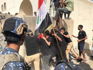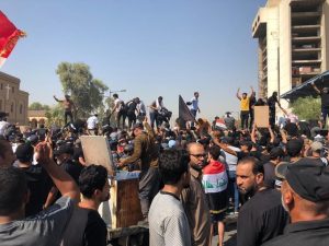 وصل المتظاهرون، صباح السبت، إلى بوابة المنطقة الخضراء وسط بغداد.