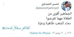 وقال الحميداوي في تغريدة عبر تويتر طالعتها الرشيد: “الجماهير أقوى من الطغاة مهما تفرعنوا، دماء الشعب طاهرة وعزة”.