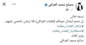 وقال العراقي في منشور عبر الفيسبوك وطالعته الرشيد، إن: “شئتم إيصال صوتكم (للقضاء العراقي) فلا نرضى بالتعدي عليهم”.