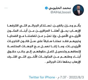 سياسةالحلبوسي: عملنا وما زلنا نعمل على سن قانون الناجيات الايزيديات لانصافهم وتحصيل حقوقهم قبل 3 سنوات 3 مشاهدات شارك الوسومالحلبوسيقد يهمك أيضا سياسة العراق وباكستان يناقشان الارتقاء بواقع التبادل التجاري والسجناء والعمالة قبل 5 ساعات 9 مشاهدات مع ياسر عامر الفصائل تنزع سلاحها و”النجباء والكتائب” يرفضون!! قبل 6 ساعات 11 مشاهدات سياسة المجلس السياسي الوطني يقرر عقد اجتماع الثلاثاء المقبل لمواصلة النقاشات قبل 7 ساعات 14 مشاهدات سياسة المجلس السياسي الوطني يؤكد الالتزام بالتوقيتات الدستورية لجلسة البرلمان قبل 7 ساعات 14 مشاهدات عربي ودولي السويد.. حادثة تدنيس جديدة للمصحف في مسجد ستوكهولم تؤجج مشاعر المسلمين قبل 7 ساعات 9 مشاهدات