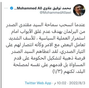 سياسةمحمد علاوي معلقاً على خطاب السيد الصدر: فرصة ذهبية لتشكيل الحكومة قبل 3 سنوات 4 مشاهدات شارك الوسوممحمد علاويقد يهمك أيضا سياسة العراق وباكستان يناقشان الارتقاء بواقع التبادل التجاري والسجناء والعمالة قبل 7 ساعات 10 مشاهدات مع ياسر عامر الفصائل تنزع سلاحها و”النجباء والكتائب” يرفضون!! قبل 8 ساعات 12 مشاهدات سياسة المجلس السياسي الوطني يقرر عقد اجتماع الثلاثاء المقبل لمواصلة النقاشات قبل 8 ساعات 16 مشاهدات سياسة المجلس السياسي الوطني يؤكد الالتزام بالتوقيتات الدستورية لجلسة البرلمان قبل 9 ساعات 14 مشاهدات عربي ودولي السويد.. حادثة تدنيس جديدة للمصحف في مسجد ستوكهولم تؤجج مشاعر المسلمين قبل 9 ساعات 9 مشاهدات