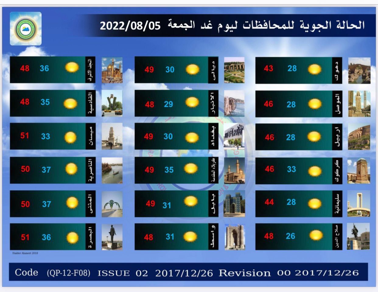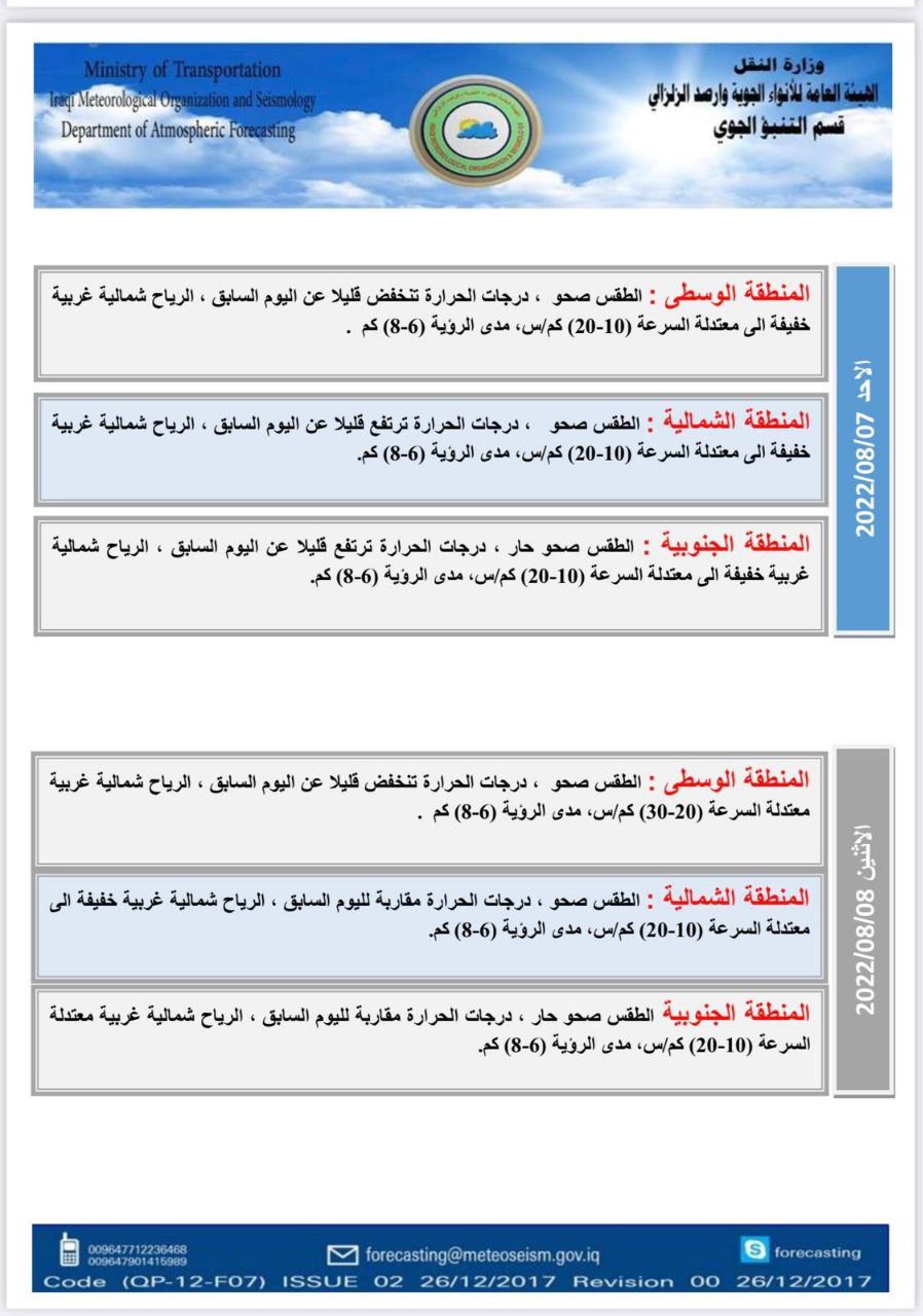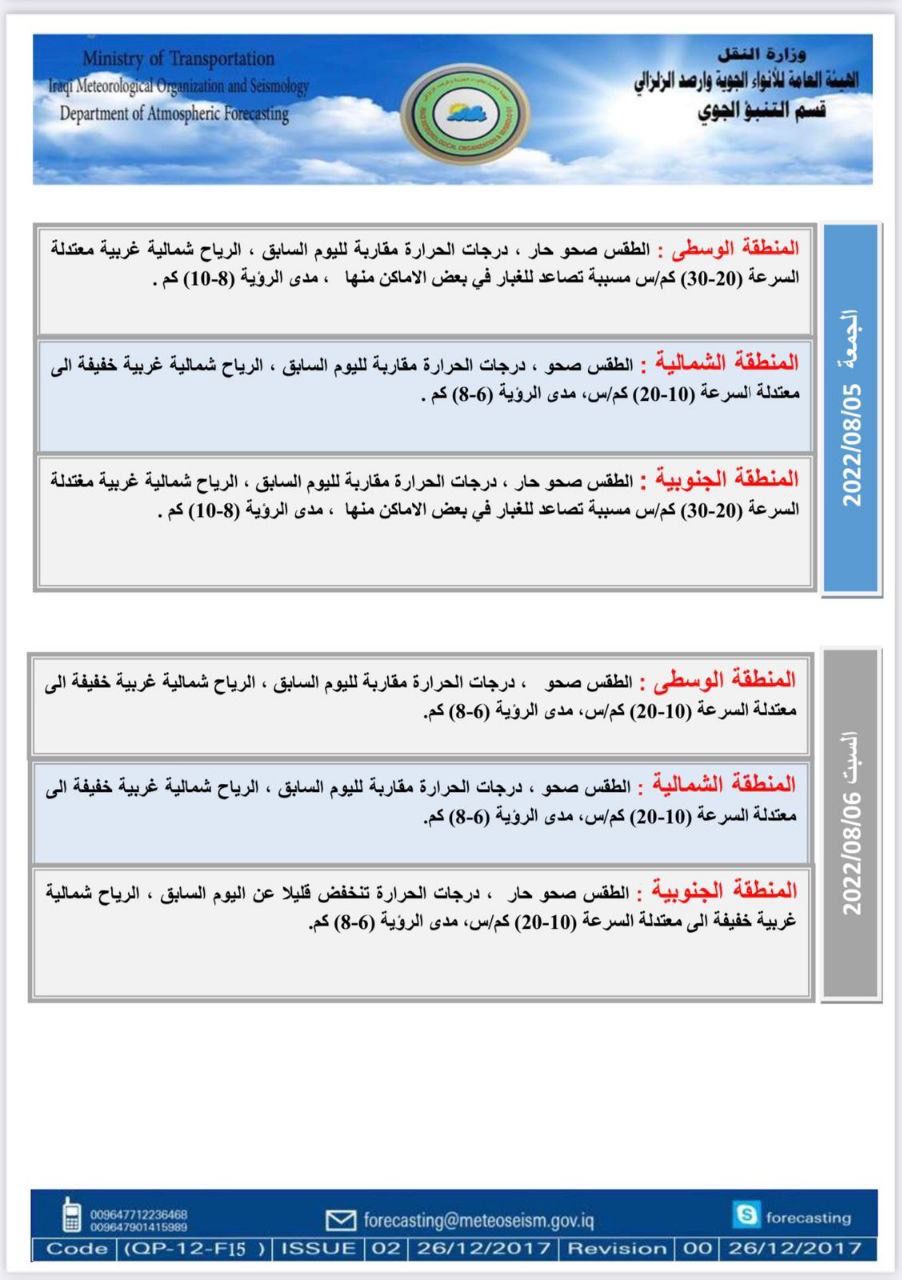 محلياتبعد موجة الحر.. تحديد موعد انخفاض درجات الحرارة في العراق قبل 3 سنوات 6 مشاهدات شارك الطقسأعلنت هيئة الانواء الجوية، حالة طقس العراق خلال الأيام المقبلة، فيما اشارت الى انخفاض درجات الحرارة اعتبارا من السبت المقبل.اقرأ ايضا العراق يستقبل موجة أمطار غزيرة.. الأنواء تحذر من سيول وفيضانات في المناطق غير المخدومة اعتباراً من الغد المالية تنفي استقبال نائبة للتفاوض مع وزيرتها بشأن مستحقات المقاولين العراق يستعد لاستقبال حالة جوية غير مستقرة وأمطار غزيرة اعتباراً من مساء الغد الصحة: نصف النزلاء في مستشفى الرشاد متماثلون للشفاء لكن ذويهم يرفضون استلامهم الوسومالطقسالعراققد يهمك أيضا أمن مقتل شاب برصاصة أطلقها منتسب أمني بالخطأ خلال "مشاجرة اعتيادية" في أبي غريب غربي بغداد قبل 3 ساعات 8 مشاهدات رياضة مدرب الأرجنتين معلقاً على قرعة المونديال: منتخب الجزائر قوي والأردن مجهول بالنسبة لي قبل 3 ساعات 16 مشاهدات محليات العراق يستقبل موجة أمطار غزيرة.. الأنواء تحذر من سيول وفيضانات في المناطق غير المخدومة اعتباراً من الغد قبل 3 ساعات 16 مشاهدات محليات المالية تنفي استقبال نائبة للتفاوض مع وزيرتها بشأن مستحقات المقاولين قبل 4 ساعات 10 مشاهدات عربي ودولي البيت الأبيض يحذر: أوروبا مهددة بـ"زوال الحضارة" خلال 20 عاماً قبل 4 ساعات 9 مشاهدات