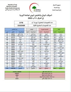 أعلنت وزارة الصحة، اليوم الجمعة، الموقف الوبائي اليومي لجائحة كورونا في عموم العراق.