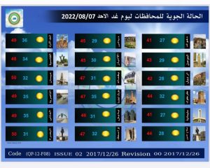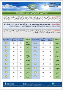 أعلنت هيئة الأنواء الجوية، اليوم السبت، عن حالة الطقس في البلاد للأيام المقبلة، فيما توقعت تصاعداً للغبار وانخفاضاً في درجات الحرارة.