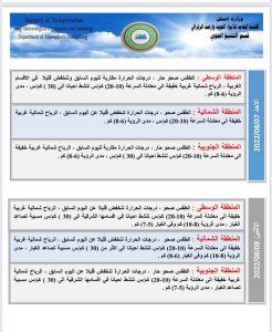 أعلنت هيئة الأنواء الجوية، اليوم السبت، عن حالة الطقس في البلاد للأيام المقبلة، فيما توقعت تصاعداً للغبار وانخفاضاً في درجات الحرارة.