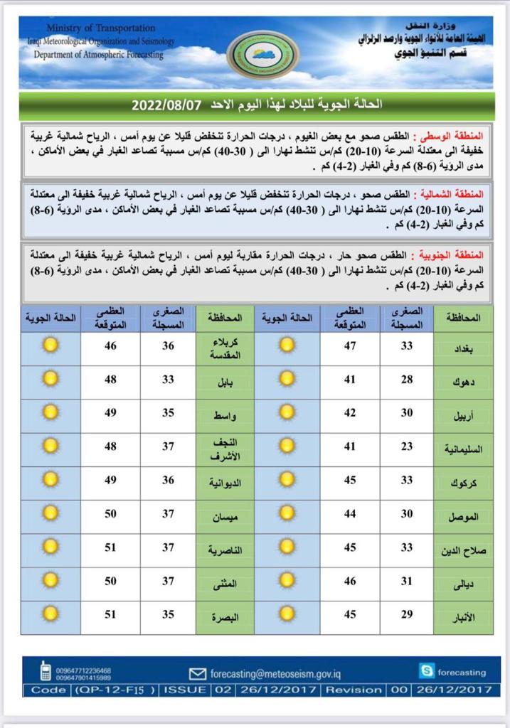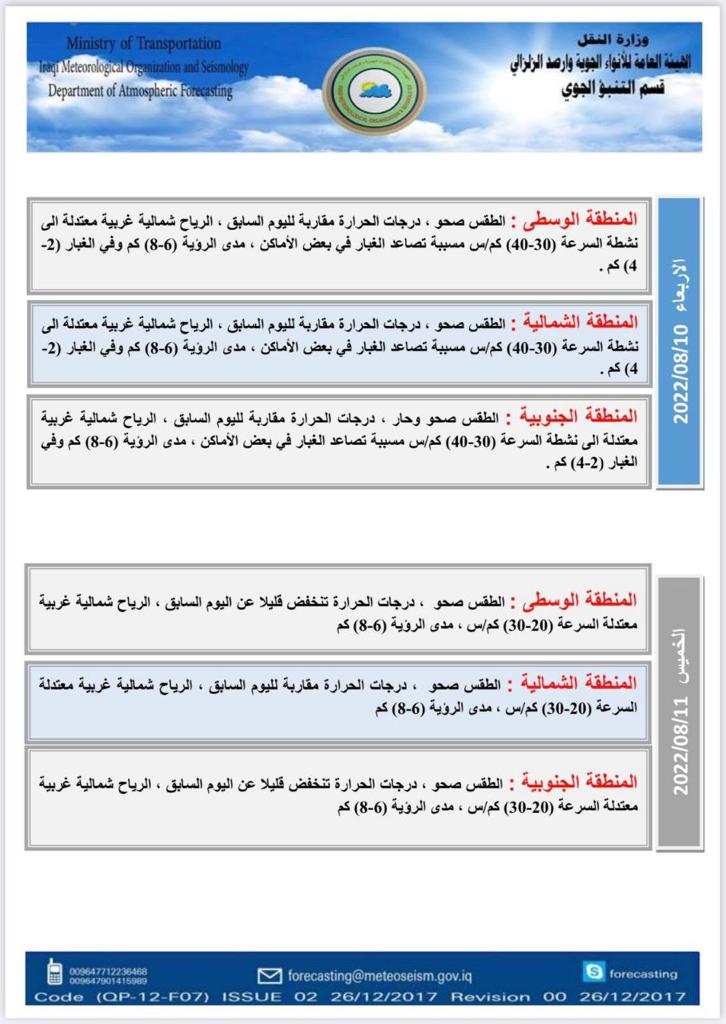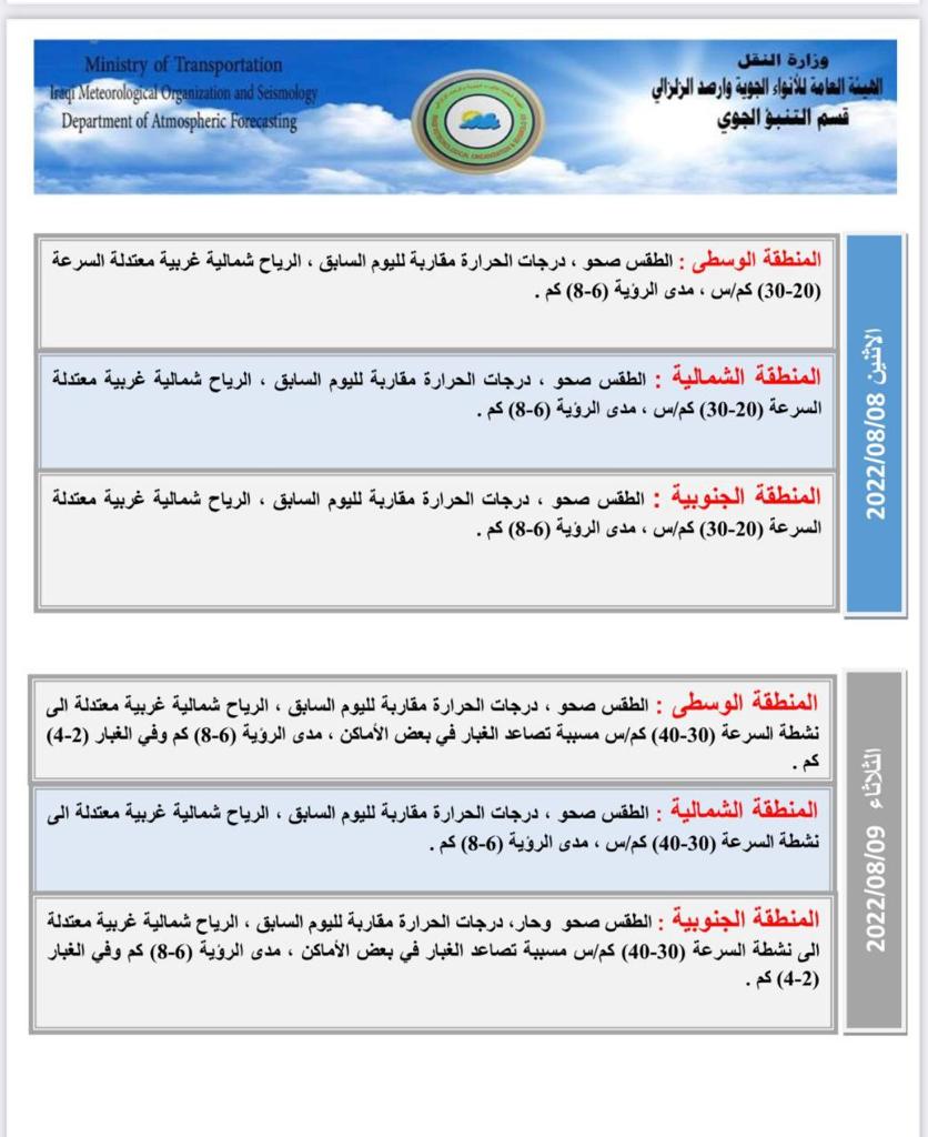 محلياتطقس العراق.. تصاعد للغبار وانخفاض بدرجات الحرارة خلال الأيام المقبلة قبل 3 سنوات 3 مشاهدات شارك الطقسأعلنت هيئة الانواء الجوية، حالة طقس العراق خلال الايام المقبلة، فيما اشارت الى انخفاض درجات الحرارة وتصاعد الغبار.اقرأ ايضا العمل تعلن تحويل أكثر من 63 ألف مستفيد من الحماية الاجتماعية إلى المؤسسات الحكومية امانة بغداد تعلن ابادة أكثر من 19 ألف كلب سائب بعد وفاة شاب في بغداد.. الصحة تحذر: داء الكلب مرض فيروسي قاتل ولقاحاته متوفرة السفارة العراقية في ليبيا: استكمال إجراءات العودة الطوعية لـ70 عراقياً دخلوا بشكل غير شرعي الوسومالطقسقد يهمك أيضا أمن الداخلية: اعتقال 4 مطلوبين دوليين بحوزتهم 200 الف حبة كبتاجون بالتعاون مع سوريا قبل 17 دقيقة 8 مشاهدات سياسة الرئيس الحلبوسي يبحث مع وفد الاعمار والتنمية أهمية استمرار الحوار لحسم الاستحقاقات الدستورية قبل 43 دقيقة 5 مشاهدات أقتصاد خبراء: عاملان رئيسيان وراء ارتفاع الذهب والفضة إلى مستويات قياسية غير مسبوقة قبل 46 دقيقة 5 مشاهدات محليات العمل تعلن تحويل أكثر من 63 ألف مستفيد من الحماية الاجتماعية إلى المؤسسات الحكومية قبل 57 دقيقة 7 مشاهدات رياضة العراق في المركز الـ58 في تصنيف "الفيفا" النهائي لعام 2025 واسبانيا تعتلي الصدارة قبل ساعة واحدة 11 مشاهدات