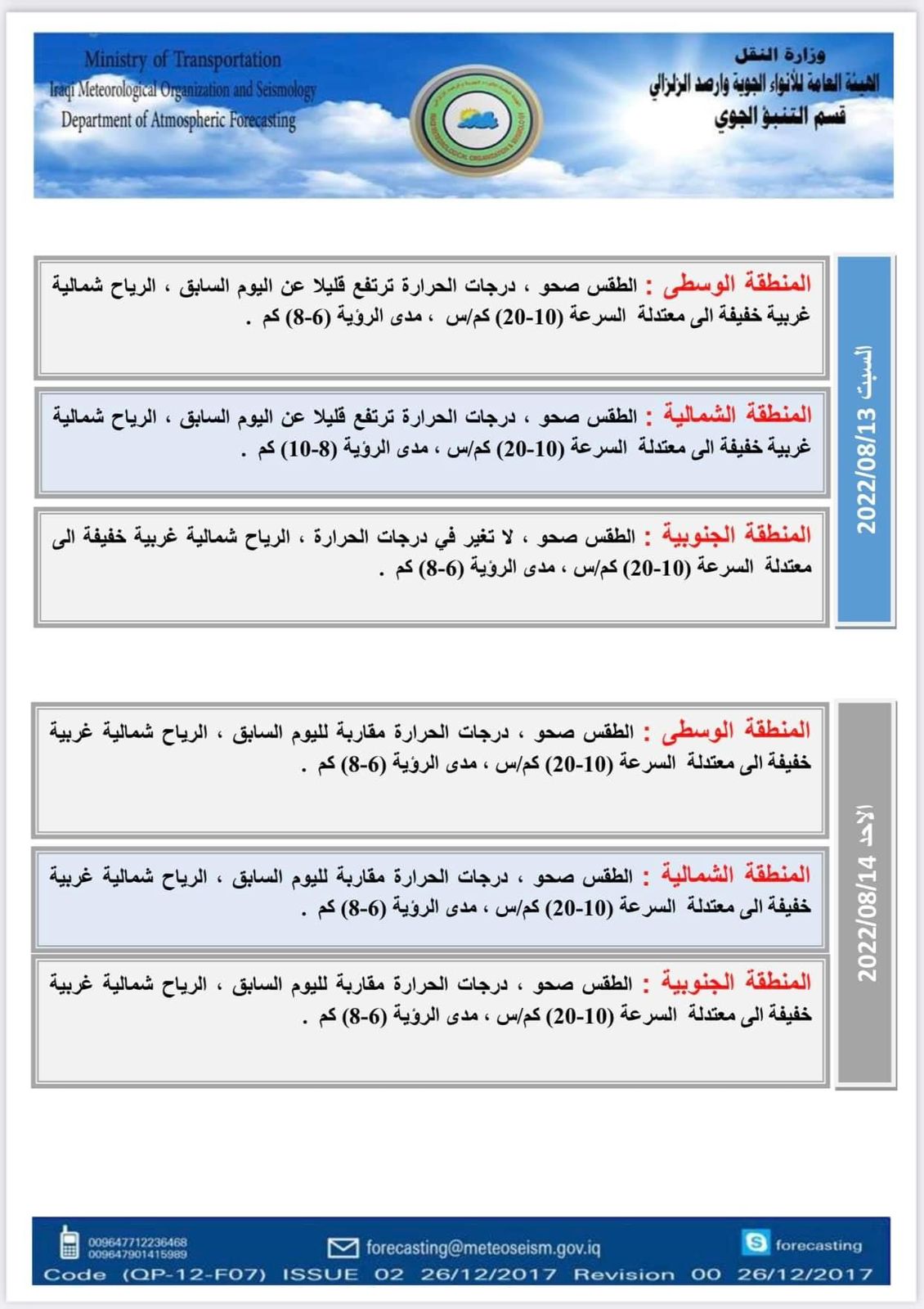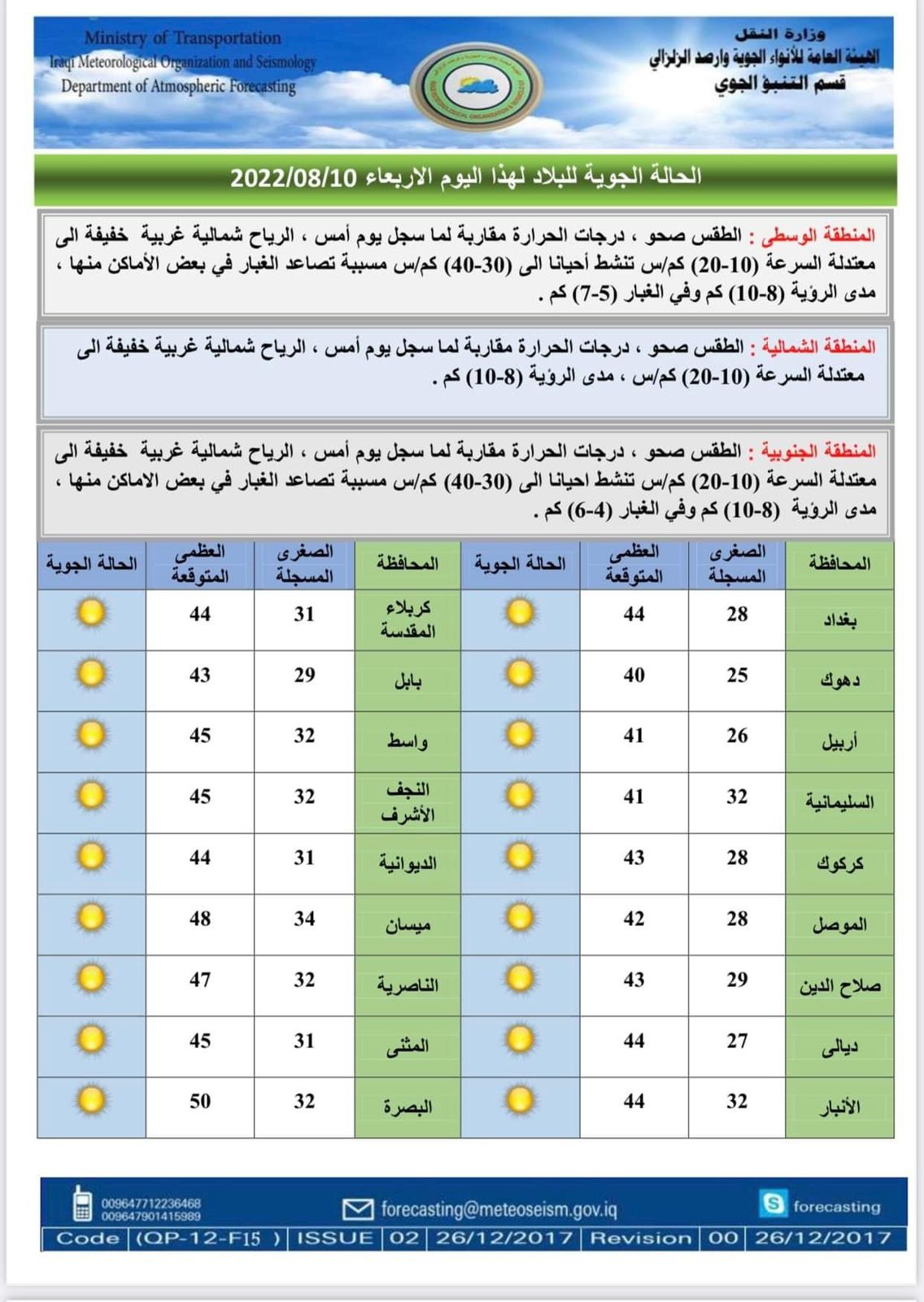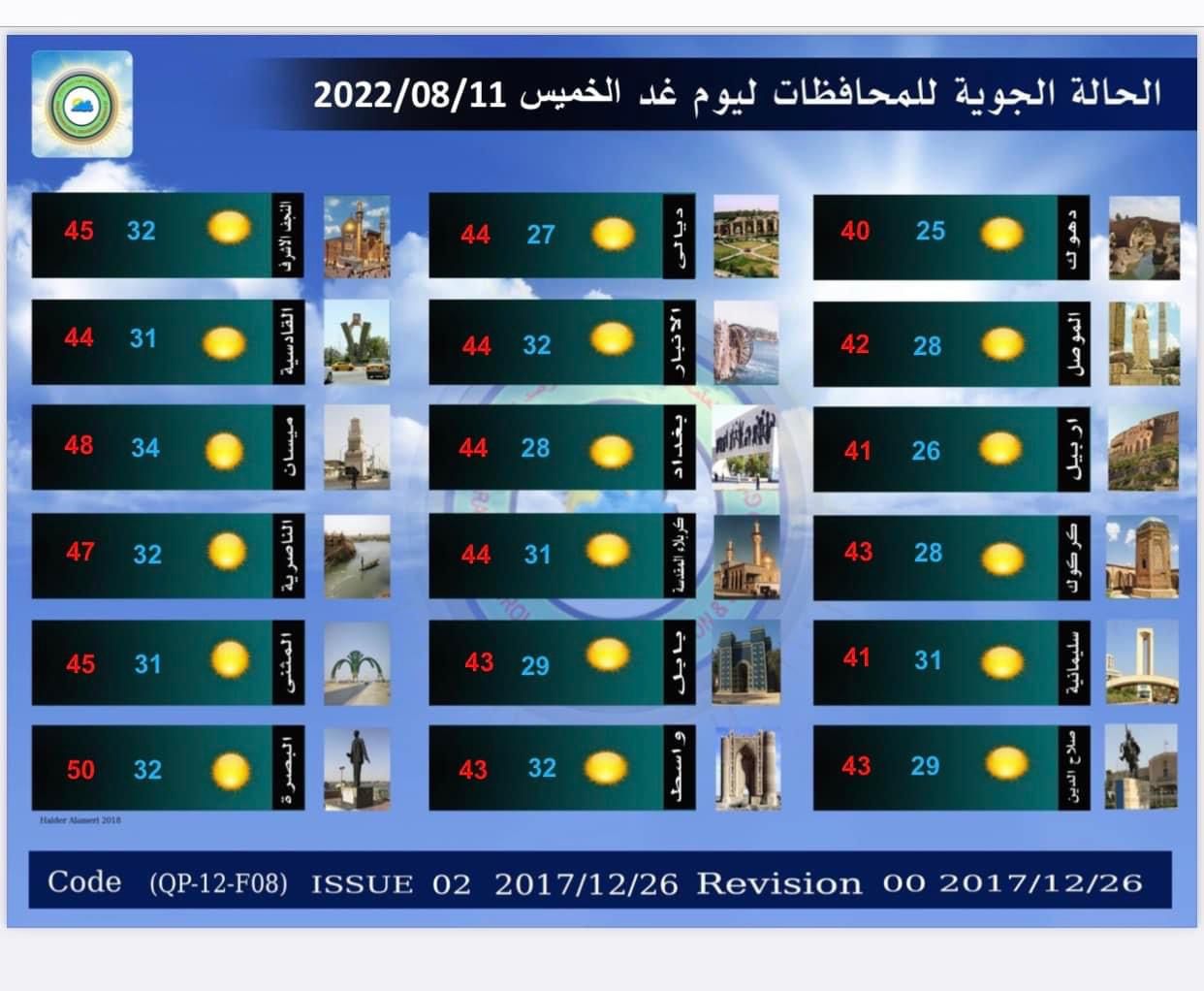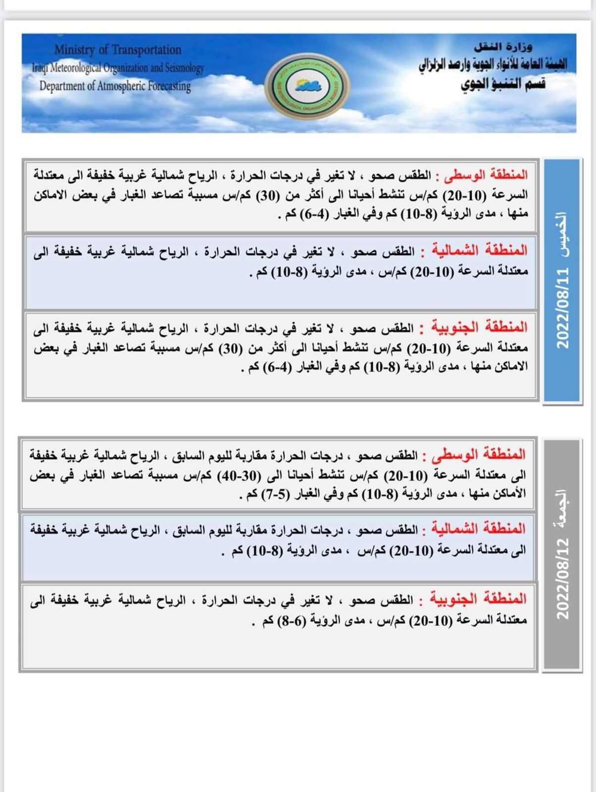 أعلنت هيئة الانواء الجوية، حالة طقس العراق خلال الأيام المقبلة، فيما اشارت الى ارتفاع الحرارة وتصاعد الغبار ببعض المناطق خلال الأيام المقبلة.