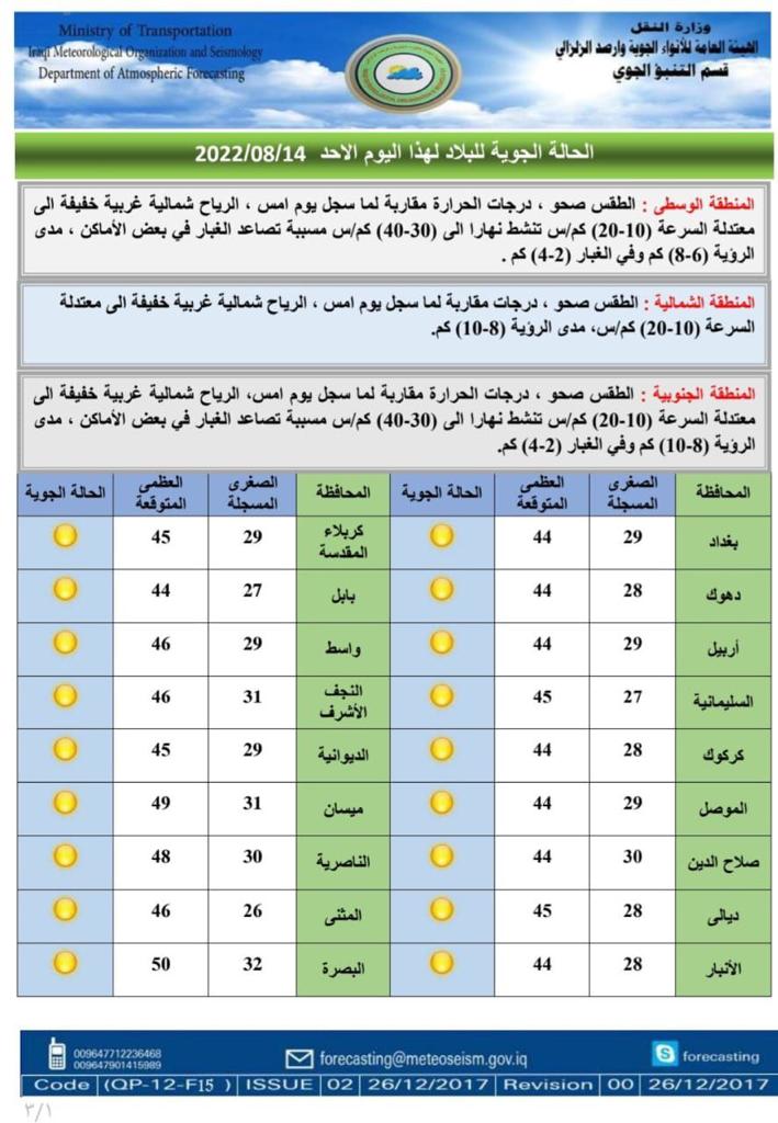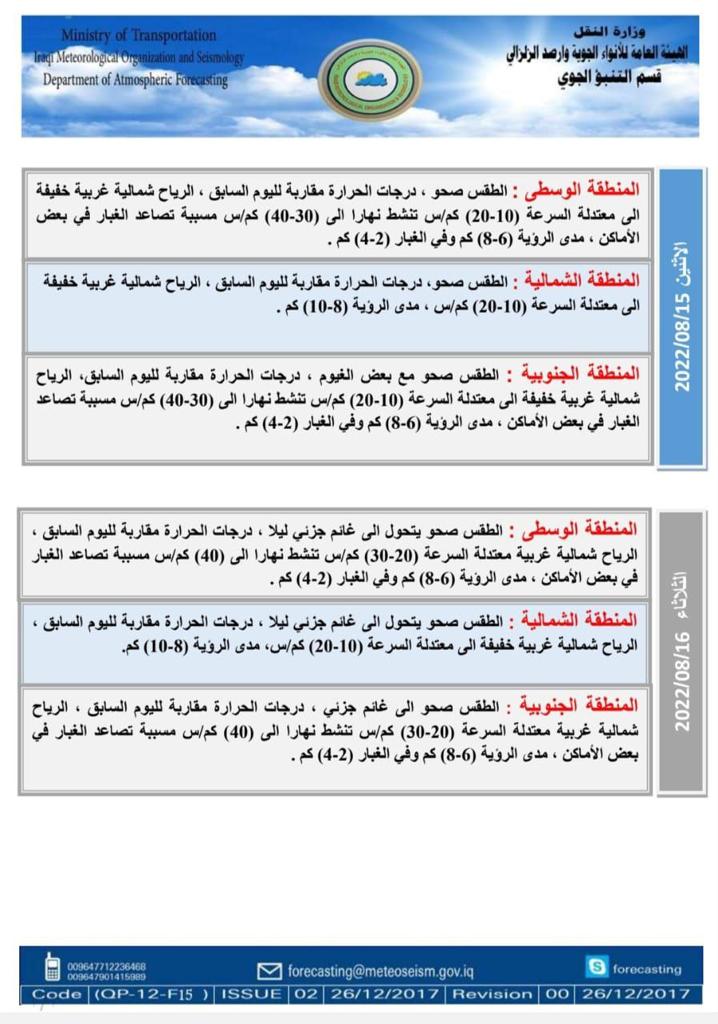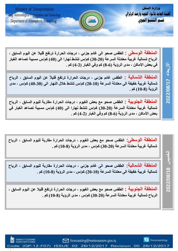 أعلنت هيئة الأنواء الجوية، اليوم الأحد، عن حالة الطقس في البلاد للأسبوع الحالي، فيما توقعت استمرار تصاعد الغبار مع ارتفاع في درجات الحرارة.