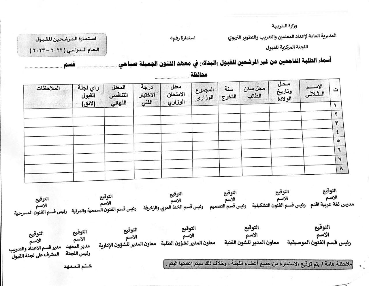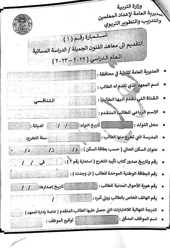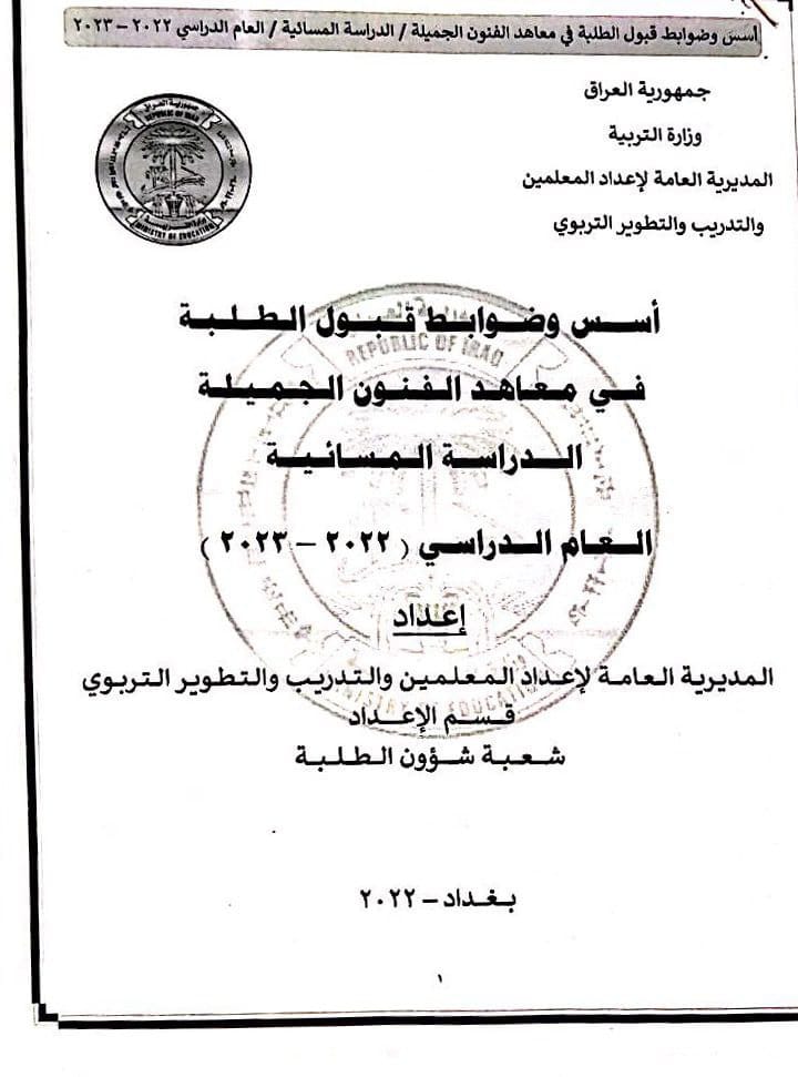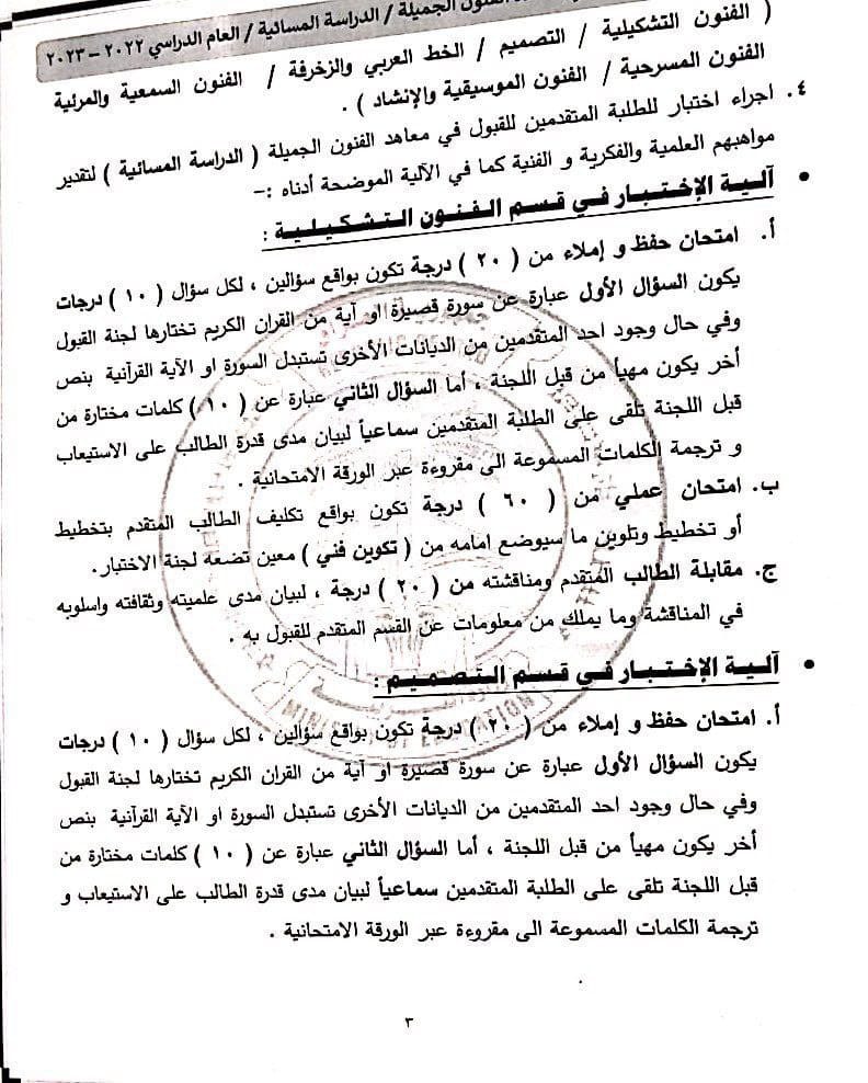 وأشارت المديرية العامة لأعداد المعلمين والتدريب والتطوير التربوي، بحسب البيان، إلى “السماح لجميع الطلبة التقديم على معاهد الفنون الجميلة الدراسة (المسائية) شرط أن يكون خريج الدراسة المتوسطة الاكاديمية أو المهنية أو ما يعادلها بموجب “معادلة الشهادة” بغض النظر عن المعدل والدور وسنة التخرج والعمر، كما يحق لجميع موظفي الدولة من خريجي الدراسة المتوسطة التقديم أيضاً لغرض اكمال دراستهم ضمن الاختصاصات الفنية الآتية :-(الفنون التشكيلية ، التصميم ، الخط العربي والزخرفة ، الفنون السمعية والمرئية ، الفنون المسرحية ، الفنون الموسيقية والانشاد)؛ إذ تكون درجة النجاح الصغرى الخاصة باختبار تلك الاختصاصات هي (60)%”.