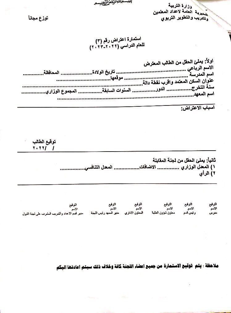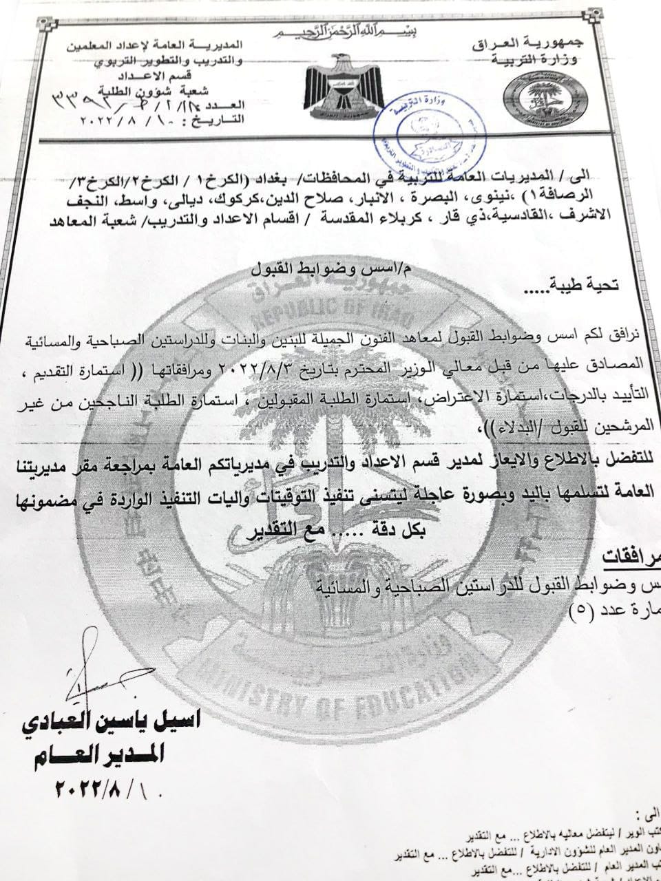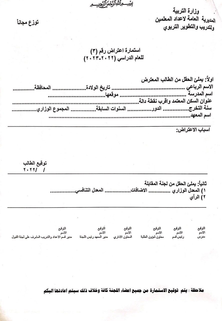 وأشارت المديرية العامة لأعداد المعلمين والتدريب والتطوير التربوي، بحسب البيان، إلى “السماح لجميع الطلبة التقديم على معاهد الفنون الجميلة الدراسة (المسائية) شرط أن يكون خريج الدراسة المتوسطة الاكاديمية أو المهنية أو ما يعادلها بموجب “معادلة الشهادة” بغض النظر عن المعدل والدور وسنة التخرج والعمر، كما يحق لجميع موظفي الدولة من خريجي الدراسة المتوسطة التقديم أيضاً لغرض اكمال دراستهم ضمن الاختصاصات الفنية الآتية :-(الفنون التشكيلية ، التصميم ، الخط العربي والزخرفة ، الفنون السمعية والمرئية ، الفنون المسرحية ، الفنون الموسيقية والانشاد)؛ إذ تكون درجة النجاح الصغرى الخاصة باختبار تلك الاختصاصات هي (60)%”.