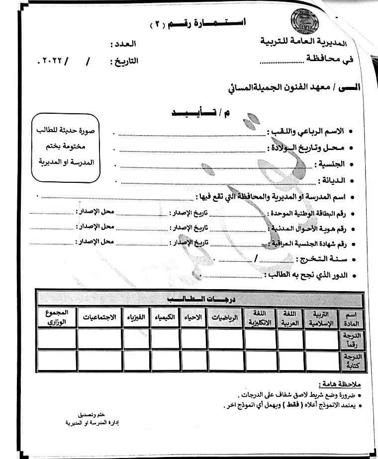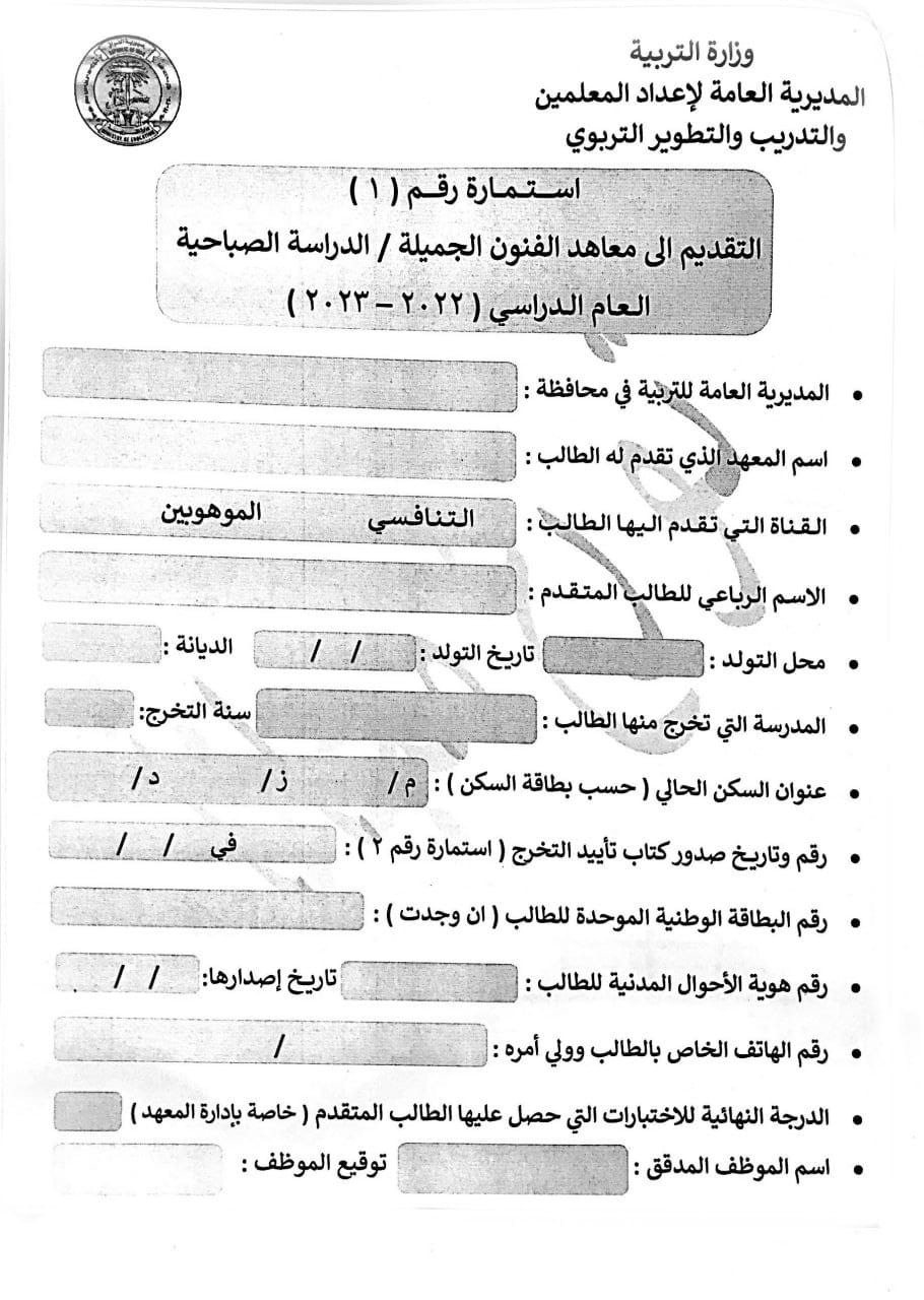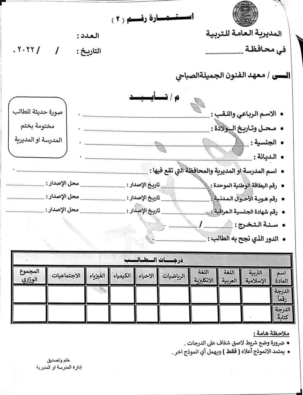 وقالت الوزارة، في بيان تلقته “الرشيد”، انه “يسمح للطلبة الناجحين في الدور ( الأول والثاني ) للعام الدراسي 2021 – 2022 التقديم إلى معاهد الفنون الجميلة (الدراسة الصباحية) على ان لا يتجاوز المواليد للذكور 2004 وللإناث 2002”.
