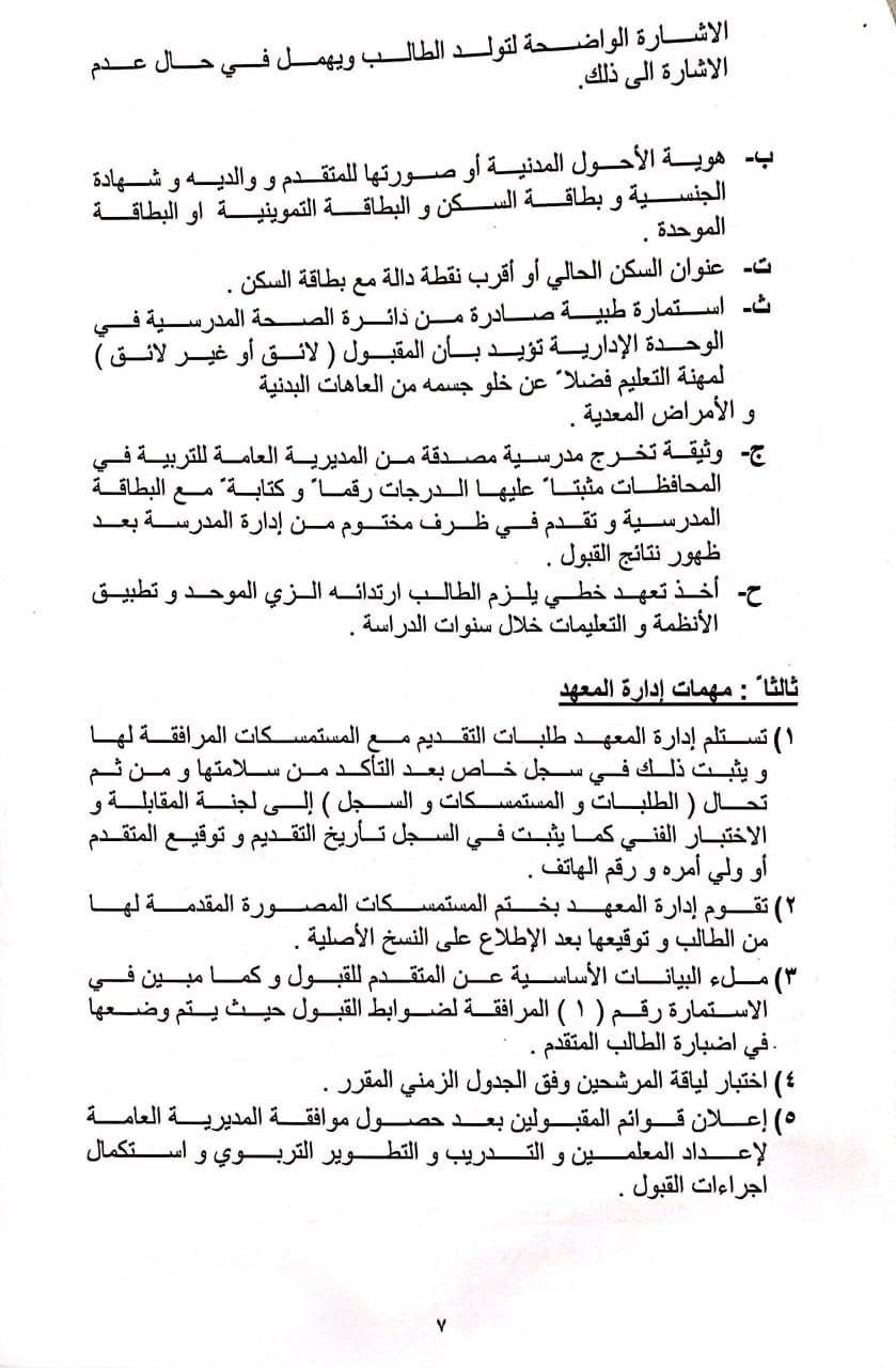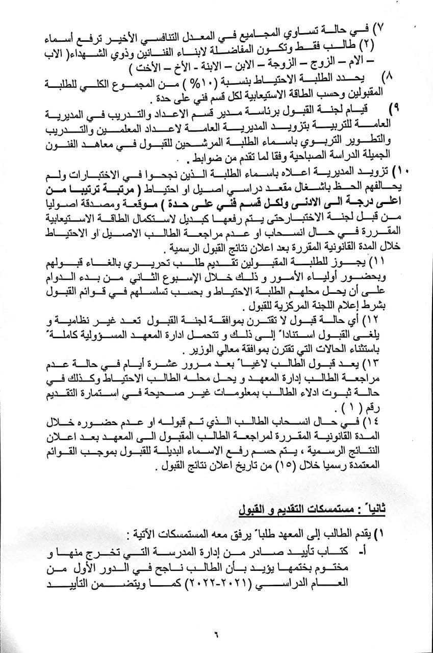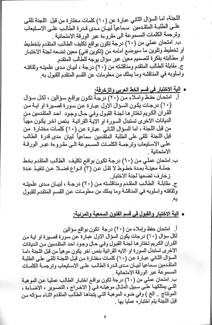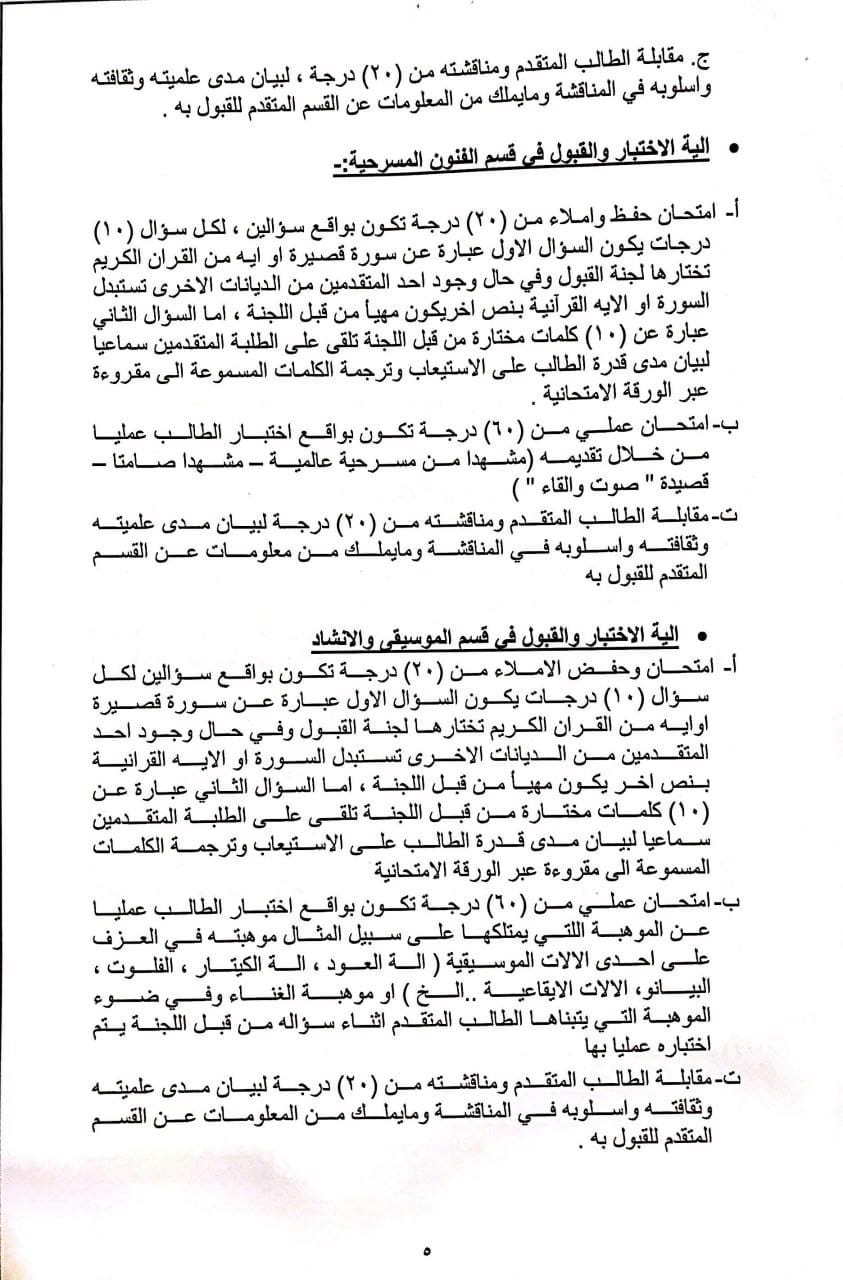 واضافت، كما “يسمح للطالب المتقدم عن طريق قناة (الموهوبين) خريج الأعوام السابقة الملتحق وغير الملتحق بالدراسة الاكاديمية على شريطة ما يلي ..(يزود الطالب الملتحق بالدراسة الإعدادية إدارة المعهد بكتاب قطع العلاقة من الإعدادية، على أن يكون مواليد الذكور 2002 ومواليد الإناث 2000 ويخضعون لاختبار مركزي، شريطة أن لا يقل درجة الطالب المتقدم عن (80% + المعدل الوزاري)، فضلا عن ذلك يتم إجراء اختبار فني للطلبة المتقدمين على قناة (التنافسي) لتقدير مواهبهم الفنية وتحتسب درجة النجاح الصغرى لهذا الاختبار (60)%؛ إذ يكون قبول الطلبة في القناتين بحسب الطاقة الاستيعابية المحددة من مجلس المعهد”.
