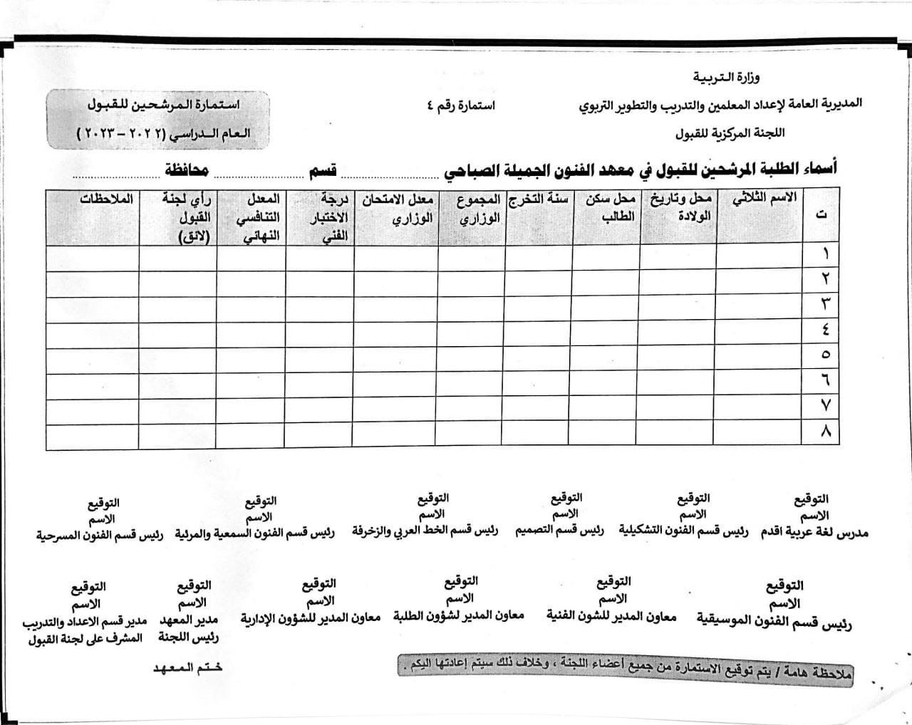 قراءة: التربية تعلن ضوابط القبول في معاهد الفنون الجميلة للدراستين الصباحية والمسائية
