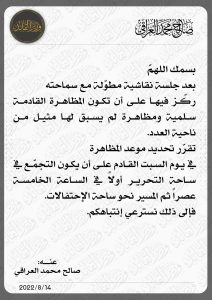 وقال العراقي، في تغريدة على تويتر تابعتها “الرشيد”، انه “بعد جلسة نقاشية مطوّلة مع سماحته ركّز فيها على أن تكون المظاهرة القادمة سلمية ومظاهرة لم يسبق لها مثيل من ناحية العدد”.