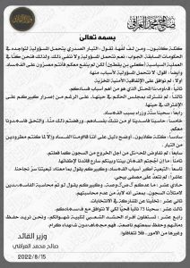 جاء ذلك خلال بيان للعراقي تلقته الرشيد وادناه نصه: ”