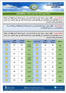 أعلنت هيئة الأنواء الجوية، اليوم الثلاثاء، عن حالة الطقس في العراق للأيام المقبلة، فيما توقعت تصاعداً للغبار في أماكن عدة وارتفاع درجات الحرارة.