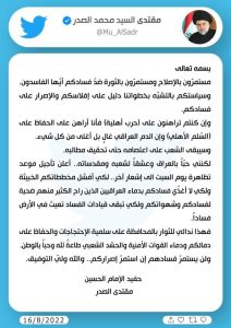 وقال السيد الصدر في تغريدة عبر تويتر طالعتها الرشيد، إن “الشعب سيبقى على اعتصامه حتى تحقيق مطالبه”.