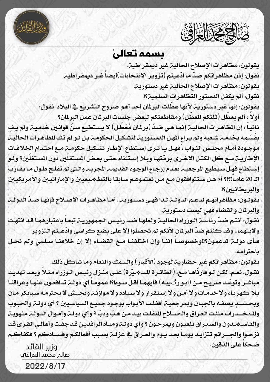 ثانياً : إن المظاهرات الحالية إنما هي ضدّ (برلمان مُعَطّل) لا يستطيع سنّ قوانين خدمية ولم يفِ بقَسَمِه بخدمة شعبه ولم يراعِ المهل الدستورية لتشكيل الحكومة