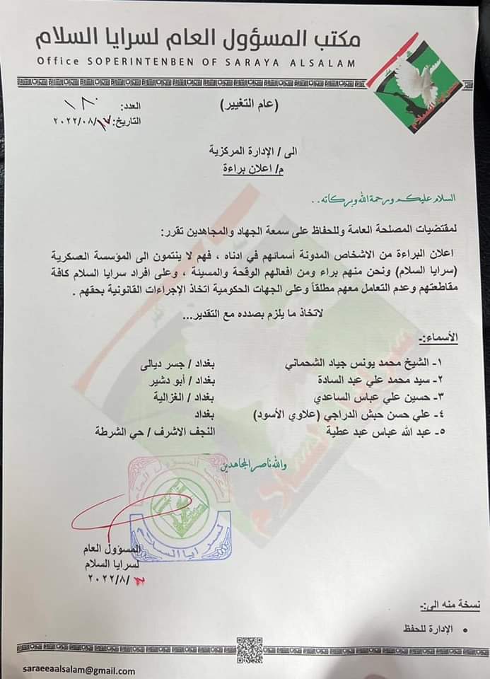 سياسةبالوثائق.. سرايا السلام تعلن البراءة من 5 أشخاص: أفعالهم وقحة ومسيئة قبل 3 سنوات 7 مشاهدات شارك الوسومسرايا السلامقد يهمك أيضا عربي ودولي ترامب يعلن تصنيف مادة "الفنتانيل" المخدرة سلاح دمار شامل قبل 12 دقيقة 4 مشاهدات محليات عمليات بغداد: نقترب من فتح جميع الطرق بعد إزالة الكتل الكونكريتية قبل 39 دقيقة 5 مشاهدات محليات طقس العراق.. أمطار رعدية وتصاعد للغبار خلال الأيام المقبلة قبل ساعة واحدة 10 مشاهدات أقتصاد النفط يتراجع بفعل محادثات أوكرانيا وبيانات ضعيفة من الصين قبل ساعة واحدة 6 مشاهدات رياضة المنتخب الاردني يهزم نظيره السعودي ويبلغ نهائي كأس العرب قبل 11 ساعة 15 مشاهدات