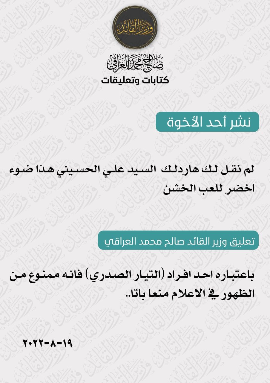 سياسةوزير السيد الصدر: علي الحسيني ممنوع من الظهور في الاعلام منعاً باتاً قبل 3 سنوات 28 مشاهدات شارك الوسومالصدرعلي الحسينيقد يهمك أيضا محليات المثنى تقرر تعطيل الدوام الرسمي الأربعاء بسبب سوء الأحوال الجوية قبل 8 ساعات 21 مشاهدات محليات النجف تقرر تعطيل الدوام الرسمي يوم غد الأربعاء بسبب سوء الأحوال الجوية قبل 9 ساعات 11 مشاهدات سياسة السيد الصدر يقرر تجميد سرايا السلام في البصرة والكوت لمدة ستة اشهر قبل 10 ساعات 14 مشاهدات رياضة الفرنسي عثمان ديمبلي يفوز بجائزة "ذا بيست" لأفضل لاعب في العالم قبل 12 ساعة 8 مشاهدات الثامنة الإجتماع الخامس للإطار .. حلقة مفرغة أيضاً قبل 12 ساعة 10 مشاهدات