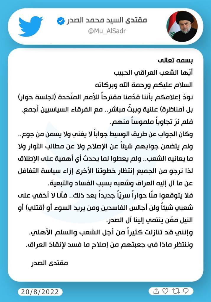 وقال الصدر في تغريدة عبر تويتر طالعتها الرشيد: “أيها الشعب العراقي الحبيب السلام عليكم ورحمة الله وبركاته نود إعلامكم بأننا قدمنا مقترحاً للأمم المتحدة ( لجلسة حوار ) بل ( مناظرة ) علنية وببث مباشر .. مع الفرقاء السياسيين أجمع ، فلم نر تجاوباً ملموساً منهم” .