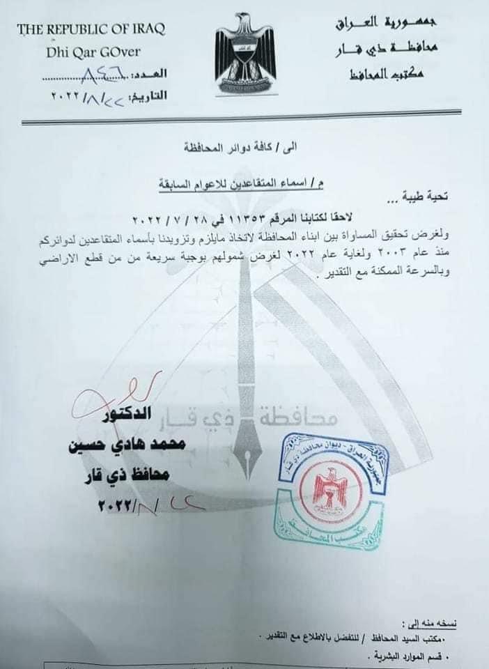 بالوثيقة.. محافظ ذي قار يوجه الدوائر تزويده بأسماء المتقاعدين من 2003 الى 2022
