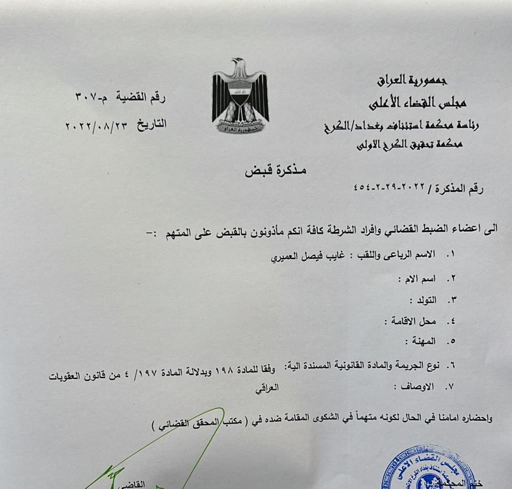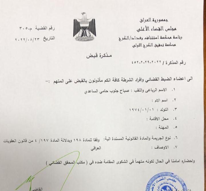 وبحسب الوثائق التي حصلت عليها “الرشيد”، فإن المذكرات صدرت بحق كل من غائب العميري على خلفية التحريض على قتل القضاة، فيما جاءت مذكرتي القبض بحق صباح الساعدي ومحمد الساعدي بتهمة تهديد القضاء.