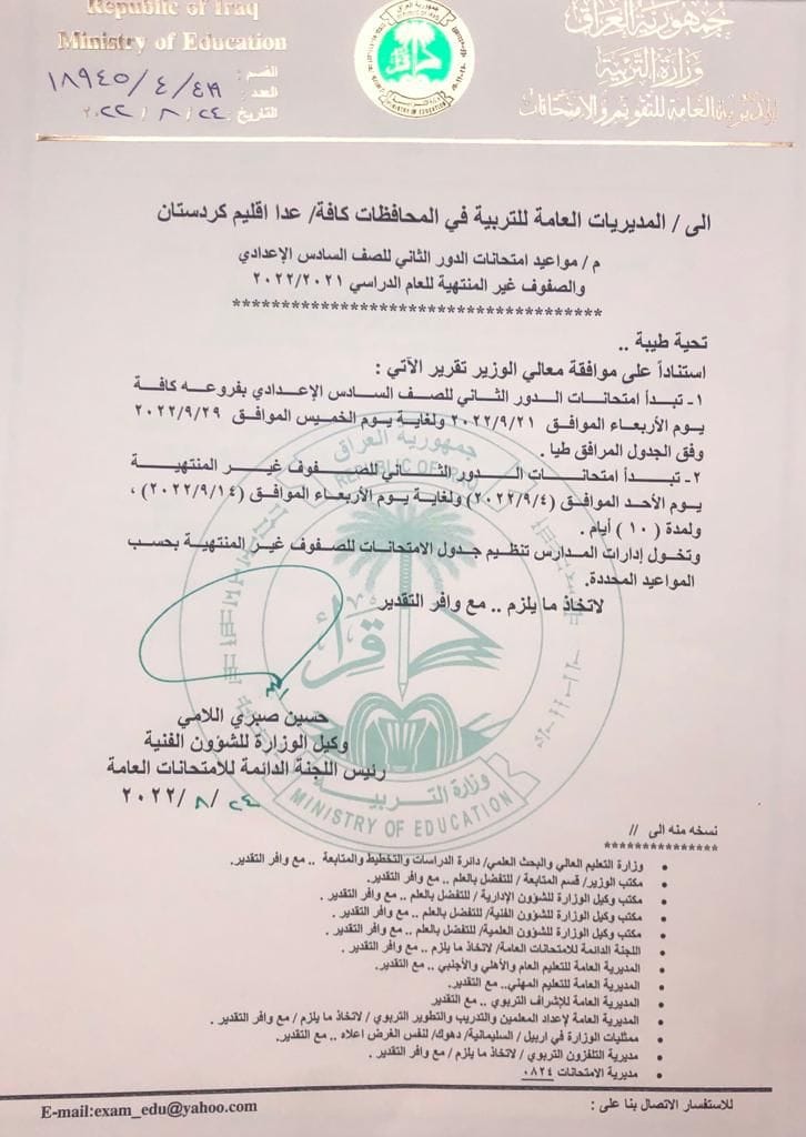 اعلنت وزارة التربية، اليوم الاربعاء، موعد امتحانات “الدور الثاني” للصف السادس الاعدادي والصفوف غير المنتهية للعام الدراسي 2021 – 2022.