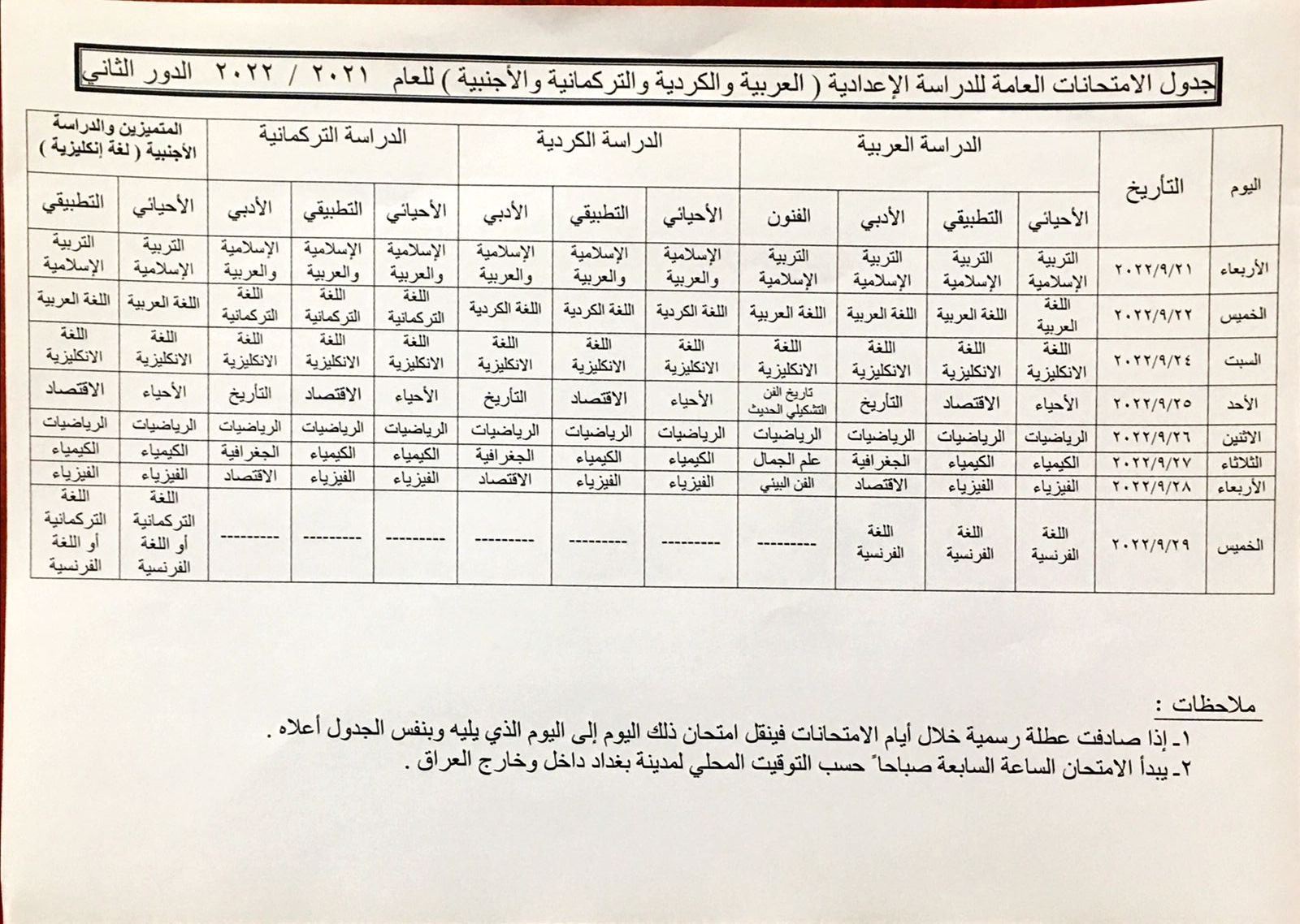 وقالت الوزارة، في بيان تلقته “الرشيد”، ان “امتحانات الدور الثاني للصف السادس الإعدادي بفروعه كافة تبدأ يوم الأربعاء الموافق 21 / 9 / 2022 ، ولغاية يوم الخميس الموافق 29 / 9 / 2022 وفق الجدول المرفق”.