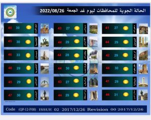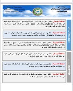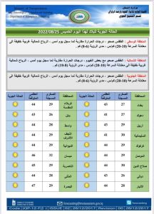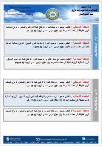 أعلنت هيئة الأنواء الجوية، اليوم الخميس، عن حالة الطقس في البلاد للأيام المقبلة، فيما توقعت ارتفاعاً في درجات الحرارة بدءاً من الأحد المقبل.