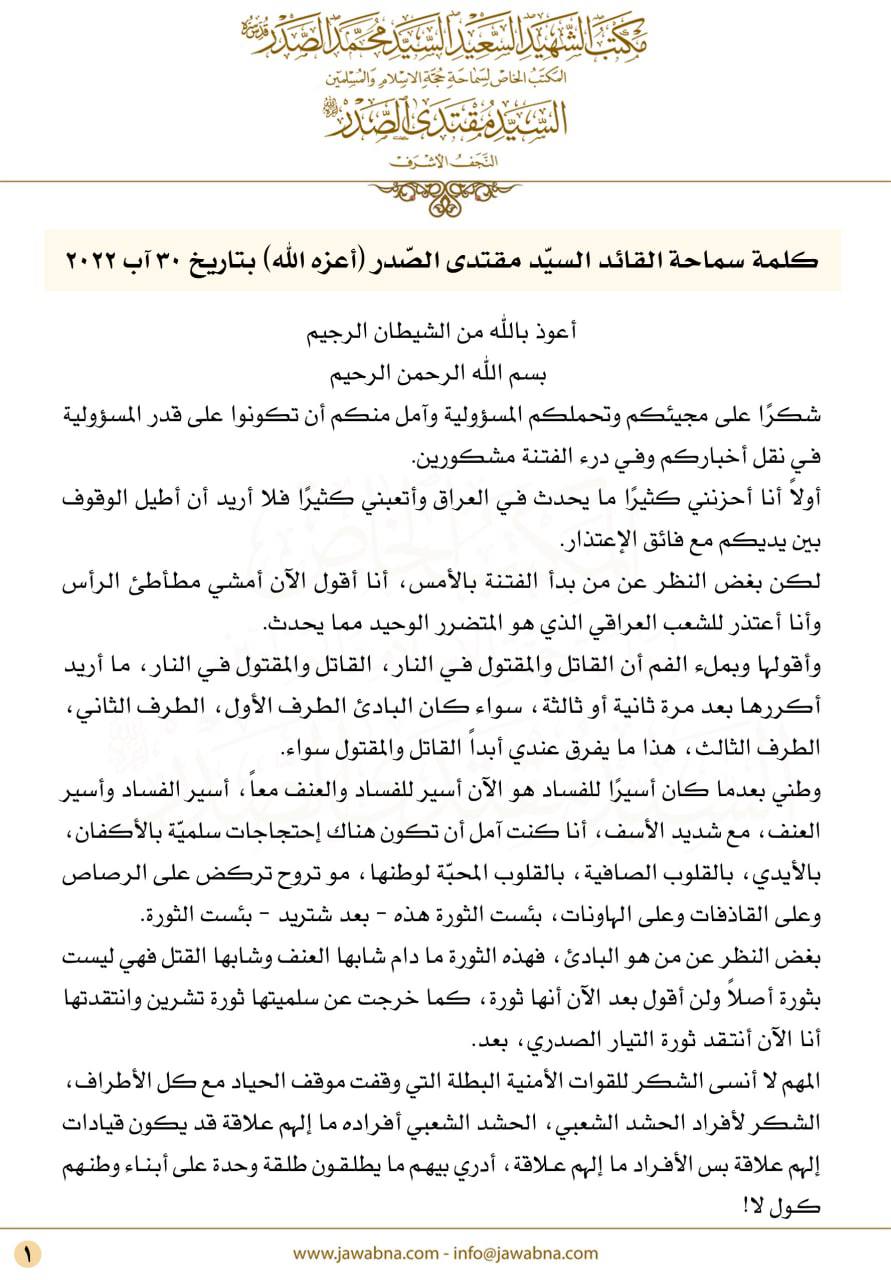 سياسةالرشيد تنشر النص الكامل لكلمة السيد الصدر قبل 3 سنوات 5 مشاهدات شارك الوسومالصدرقد يهمك أيضا أمن الاستخبارات العسكرية تطيح بـ18 متهماً بقضايا قانونية مختلفة في أربع محافظات قبل 12 دقيقة 3 مشاهدات محليات القضاء يصدر إحصائية بحالات الزواج والطلاق خلال شهر تشرين الثاني الماضي قبل 20 دقيقة 4 مشاهدات ثقافة وفن بطلة فيلم "اللي بالي بالك".. وفاة الفنانة المصرية نيفين مندور إثر حريق بمنزلها قبل 39 دقيقة 6 مشاهدات أمن الداخلية: انخفاض الجرائم الإرهابية بنسبة 88% والدكات العشائرية بنسبة 92 في المئة قبل 41 دقيقة 5 مشاهدات أقتصاد انخفاض اسعار صرف الدولار في البورصة مع بدء التداول قبل ساعة واحدة 4 مشاهدات