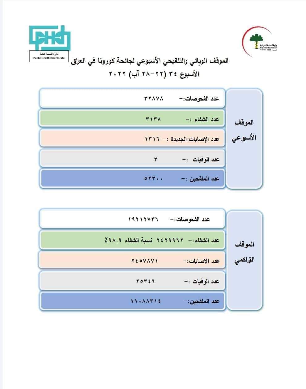 أعلنت وزارة الصحة، الموقف الوبائي الأسبوعي لفيروس كورونا في العراق.