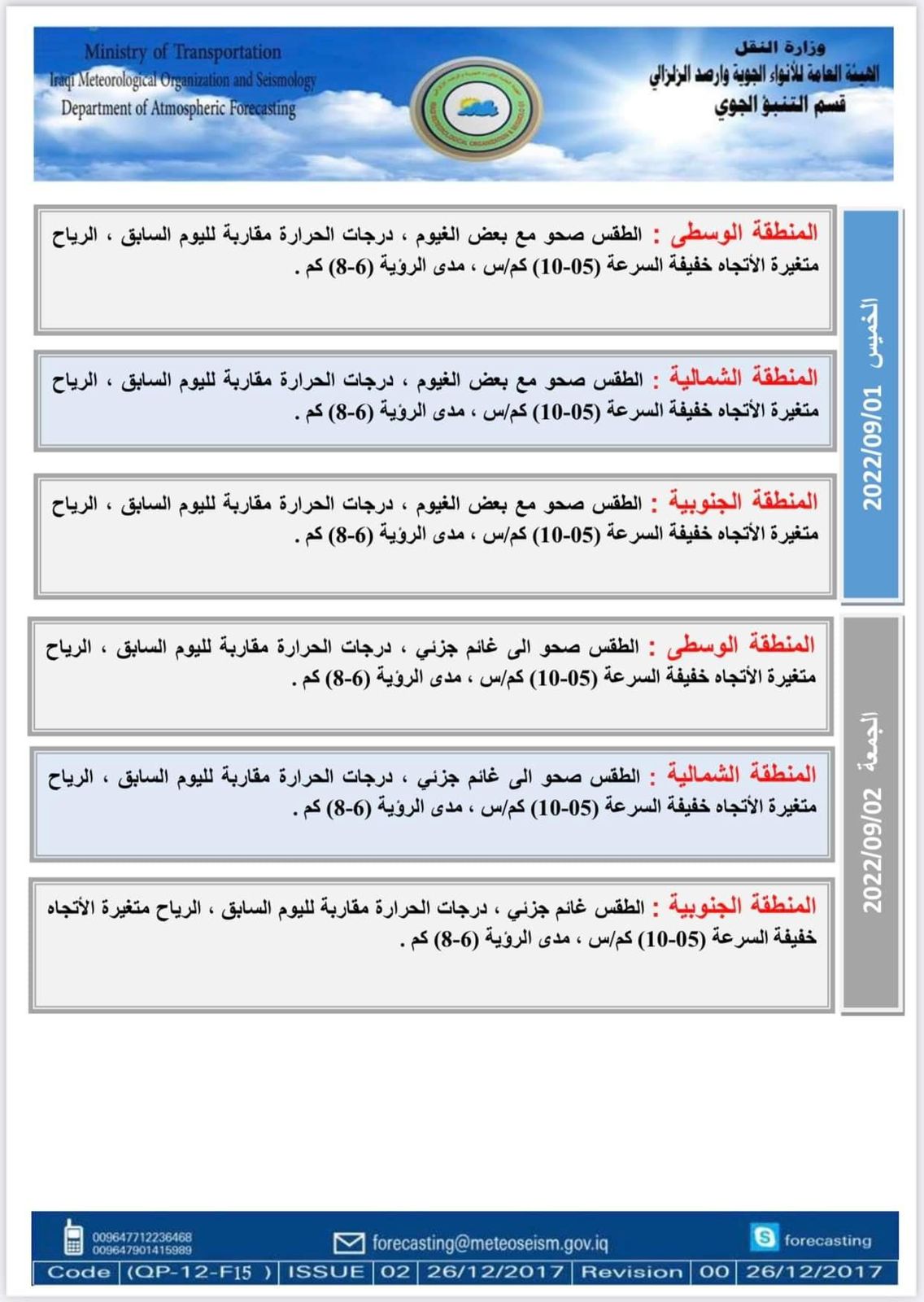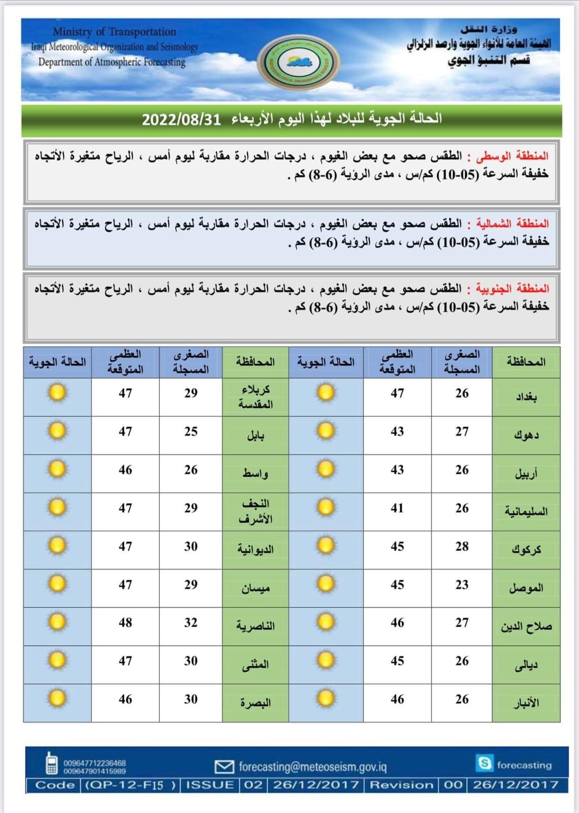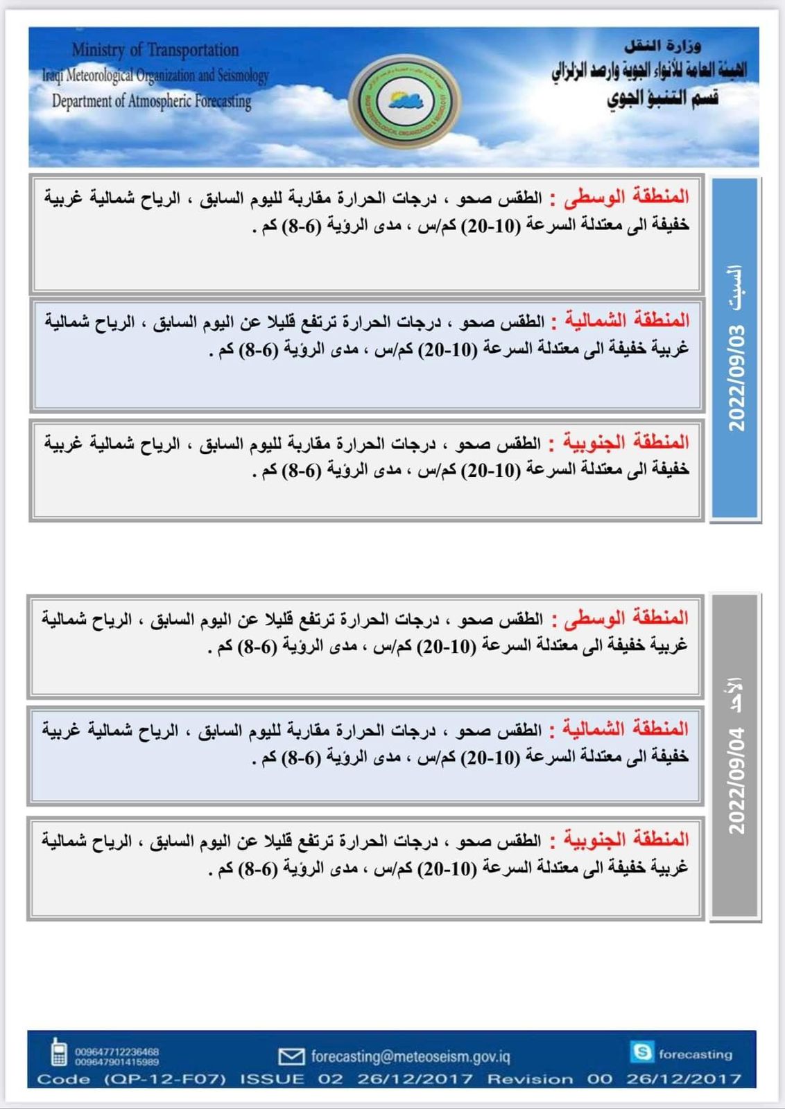 أعلنت هيئة الأنواء الجوية، اليوم الأربعاء، عن حالة الطقس في البلاد للأيام المقبلة، فيما توقعت ارتفاعاً بدرجات الحرارة الأسبوع المقبل.
