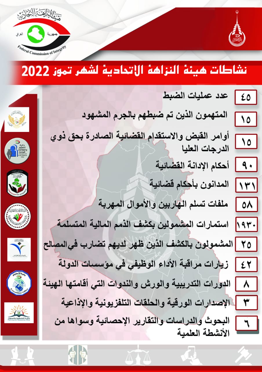 وذكرت الهيئة في بيان، أن “عملياتها ونشاطاتها والنتائج المتحققة خلال شهر تموز الماضي، تمثلت في 45 عملية ضبط، و15 متهماً تم ضبطهم بالجرم المشهود، و15 أمر قبض واستقدام بالأوامر القضائية الصادرة بحق ذوي الدرجات العليا”.