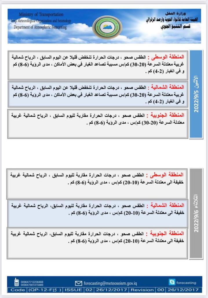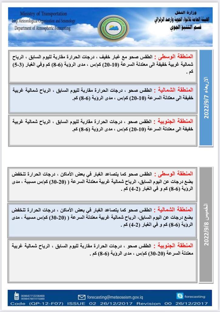 أعلنت هيئة الأنواء الجوية، اليوم الأحد، عن حالة الطقس في البلاد للأيام المقبلة، فيما توقعت تصاعداً للغبار وانخفاضاً في درجات الحرارة نهاية الأسبوع الحالي.
