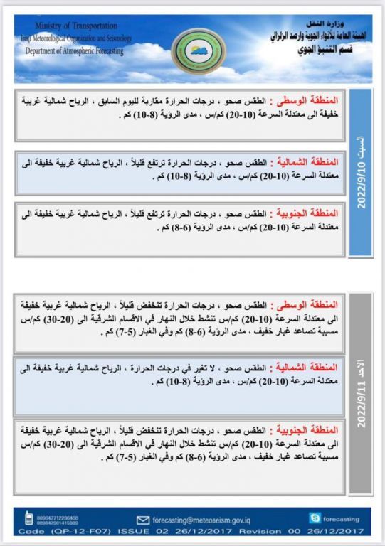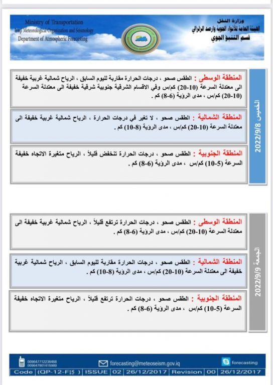 محلياتطقس العراق.. تصاعد للغبار وحرارة مرتفعة خلال الأسبوع المقبل قبل 3 سنوات 2 مشاهدات شارك الطقسأعلنت هيئة الأنواء الجوية، اليوم الأربعاء، عن حالة الطقس للأيام المقبلة، فيما توقعت تصاعداً للغبار بدءاً من الأحد المقبل. الوسومطقس العراققد يهمك أيضا أمن مقتل شاب برصاصة أطلقها منتسب أمني بالخطأ خلال "مشاجرة اعتيادية" في أبي غريب غربي بغداد قبل ساعة واحدة 7 مشاهدات رياضة مدرب الأرجنتين معلقاً على قرعة المونديال: منتخب الجزائر قوي والأردن مجهول بالنسبة لي قبل ساعة واحدة 12 مشاهدات محليات العراق يستقبل موجة أمطار غزيرة.. الأنواء تحذر من سيول وفيضانات في المناطق غير المخدومة اعتباراً من الغد قبل ساعتين 16 مشاهدات محليات المالية تنفي استقبال نائبة للتفاوض مع وزيرتها بشأن مستحقات المقاولين قبل ساعتين 10 مشاهدات عربي ودولي البيت الأبيض يحذر: أوروبا مهددة بـ"زوال الحضارة" خلال 20 عاماً قبل ساعتين 9 مشاهدات