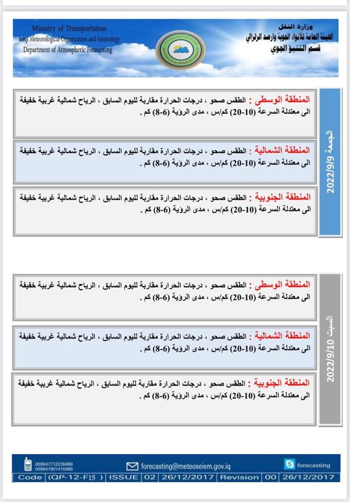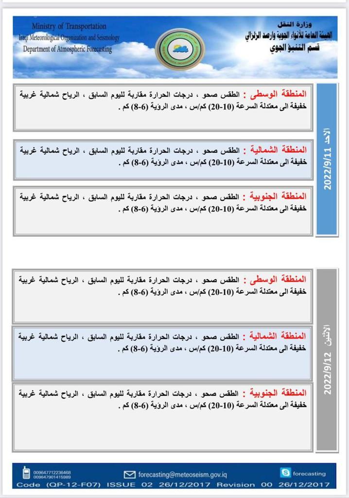 أعلنت هيئة الأنواء الجوية، اليوم الخميس، عن حالة الطقس في البلاد للأيام المقبلة، فيما توقعت تسجيل درجات حرارة لـ4 محافظات غداً 48 مئوية.