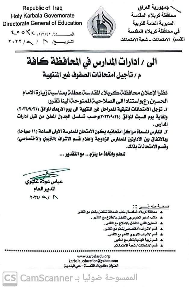وذكر المكتب الإعلامي للمحافظ نصيف الخطابي في بيان تلقته “الرشيد”، أنه “من أجل تطبيق الخطط الأمنية والخدمية وفتح الأبواب أمام أهالي كربلاء المقدسة لاستضافة الجموع المليونية لزيارة الإمام الحسين عليه السلام، تقرر أن تكون العطلة المحلية لزيارة الأربعين ابتداءً من يوم الأحد 11 أيلول الجاري وحتى الـخميس الخامس عشر منه، عدا موظفي ديوان محافظة كربلاء والمؤسسات الأمنية والخدمية كافة”.